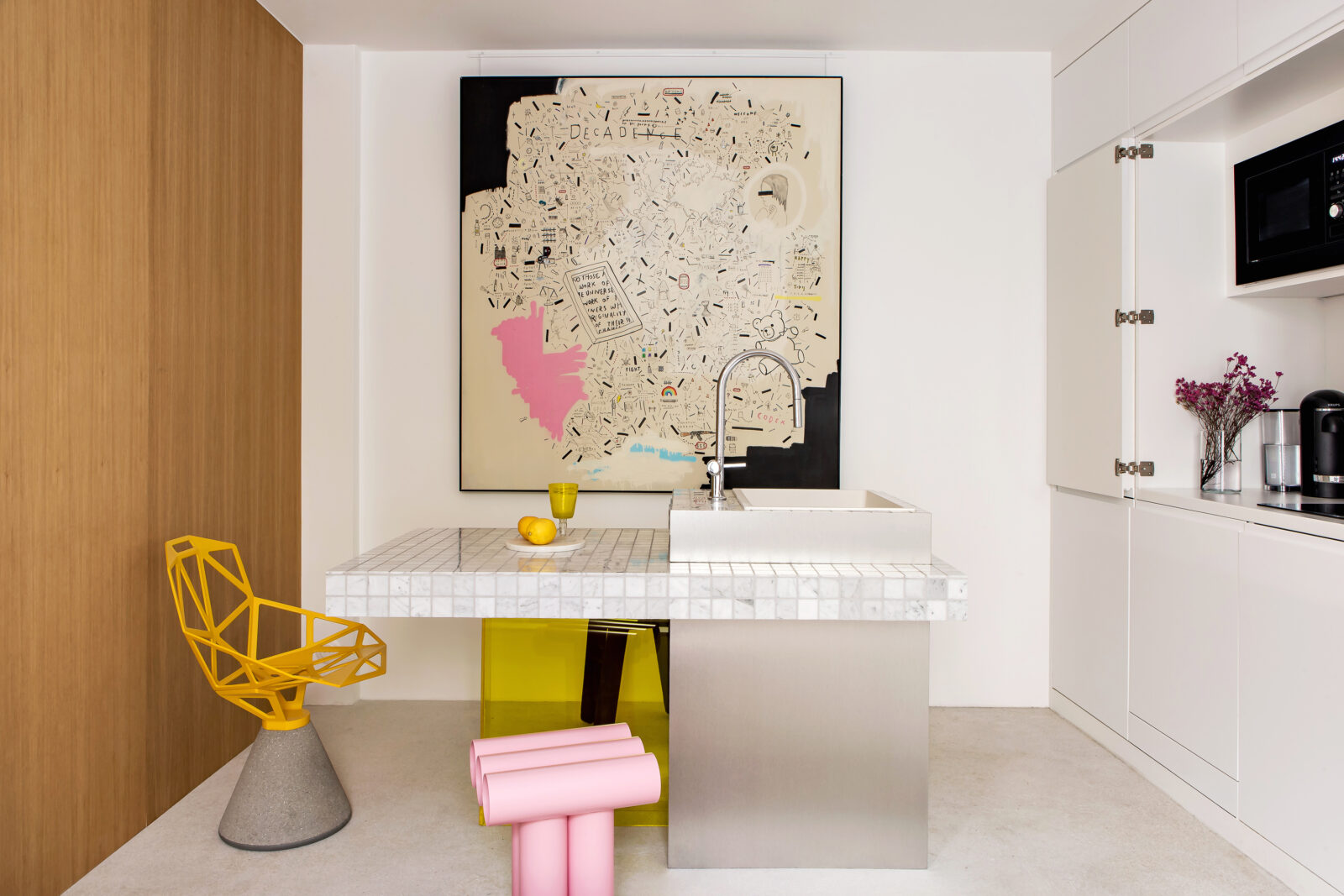 Originally from the north of France, Nicolas moved to Paris in 2018 after spending two years in Chicago and another two in Mayotte. Now an HR strategy and digital transformation consultant, he cultivates his taste for the arts, architecture and design in his free time, as demonstrated in this collaboration with Studio IDÀ. The apartment had not been renovated for several decades: “the humidity-damaged floor, the cracked ceilings, and the suffocating partitioning weren’t a hindrance,” recalls Nicolas. “Venturing into an overhaul requires an active imagination and a no-compromise approach.” His exacting specifications were not intended to undermine the architects’ aesthetic: “Nicolas was very open to clever solutions and fun ideas, and he trusted us to highlight the materials and, above all, his collections and works of art.” art.”“I wanted a sort of capsule with a timeless feel and a strong identity,” continues Nicolas. “I wanted it to have an art gallery feel, with concrete and Plexiglas, but also a hidden kitchen with a large fridge, and a large dressing room, all with a sense of flow.” And all that, in just under 35 square meters of space. The architects drew inspiration from Japanese architecture to create this ambitious roadmap: “over there, spaces and their interrelationships are shaped by the notion of progression and threshold. We drew inspiration from this to avoid creating a feeling of suffocation. The space is designed as a journey through increasingly intimate spaces.”
