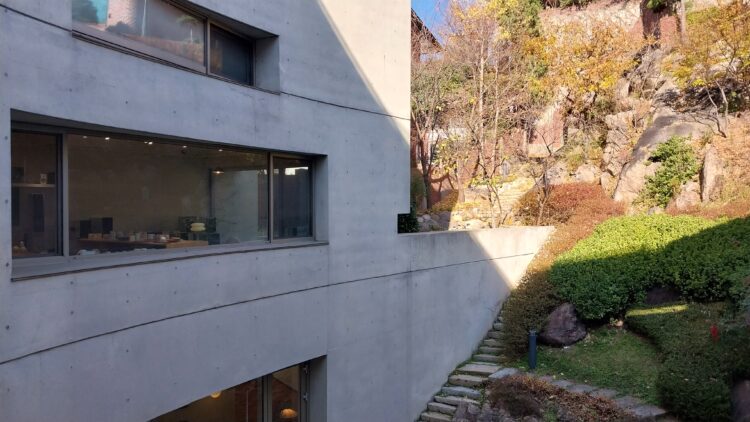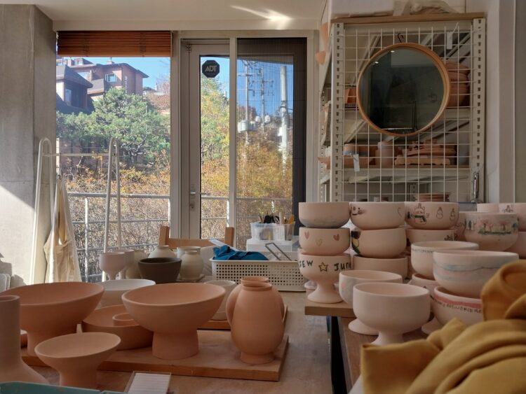 Cherchant à prolonger la tranquillité que procure la thérapie coréenne, je me suis rendue à Pyeongchang-dong, un quartier aisé regorgeant de galeries et de musées d’art, niché sous le regard des monts Bukhan et Bukak. Dans cette enclave, j’ai découvert doteon, un studio de céramique et une salle d’exposition de haut-parleurs haut de gamme, un joyau niché dans l’élégance de Mimesis Art House, un chef-d’œuvre architectural de Jun-sung Kim. La fondatrice et céramiste, Hye-min Park, originaire de ce quartier, a exprimé sa profonde affection pour cet environnement paisible. « J’ai imaginé un espace où l’art de la céramique pourrait s’épanouir en harmonie avec la quiétude de ce cadre particulier », explique-t-elle. Au-delà des cours de céramique standard et intensifs, doteon intègre de manière unique les mélodies célestes de la musique à l’art tactile de la céramique, créant ainsi une expérience multisensorielle. L’espace se double d’une galerie d’art où sont exposées les collections remarquables de Park, notamment la Layer Series, ainsi que des pièces exceptionnelles d’autres artistes. L’atelier, avec ses grandes fenêtres qui capturent le paysage en constante évolution, était aussi confortable qu’une maison. « J’ai l’intention de présenter un plus large éventail d’œuvres d’artisans coréens délicats, afin que les gens puissent rencontrer l’artisanat dans leur vie quotidienne », affirme-t-elle avec un enthousiasme vigoureux.