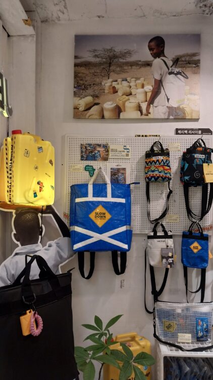 Situé à proximité du parc forestier de Séoul, adjacent au quartier animé de Seongsu, les visiteurs sont attirés à l’intérieur par une imposante peluche de girafe et découvrent JERRYBAG, une entreprise sociale engagée dans l’amélioration de la sécurité des piétons pour les enfants en Ouganda. Joong-yeol Park, PDG et cofondateur de l’entreprise, a fait part de son parcours inspirant : « Après m’être spécialisé dans la durabilité créative à l’université d’Aalto, j’avais envie d’avoir un impact tangible sur le monde en développement. Un projet à court terme avec l’UNICEF en Ouganda a créé un lien avec le pays, et j’ai eu la chance de rencontrer un superviseur ougandais. » Témoin des défis auxquels sont confrontées les communautés rurales, en particulier la tâche ardue d’aller chercher de l’eau, il a conçu une bâche durable, d’origine locale, le JERRYCAN BAG pour les jerrycans. Cette solution avancée allège non seulement le fardeau du transport de l’eau, mais sert également de sac d’école polyvalent, incorporant des matériaux réfléchissants pour une meilleure sécurité. Conscient des besoins plus larges des enfants, en particulier de ceux qui manquent de ressources éducatives essentielles, il étudie actuellement les moyens de renforcer encore la valeur éducative de ces sacs. La marque JERRYBAG, forte d’une décennie d’existence, a inauguré un centre de design durable à Kampala, en complément de sa salle d’exposition de Séoul. Ce nouveau lieu illustre l’engagement de la marque en faveur de l’économie circulaire et jette un pont inattendu entre les continents.