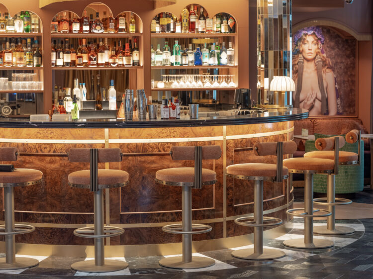 Le bar sur mesure, tout en rondeurs de bois verni acajou et souligné de laiton, déploie une esthétique théâtrale accentuée par un jeu de marbres polychromes au sol. Ce patchwork fonctionne à la fois comme signal visuel et comme trame permettant de masquer les joints de dilatation nécessaires sur cette surface.