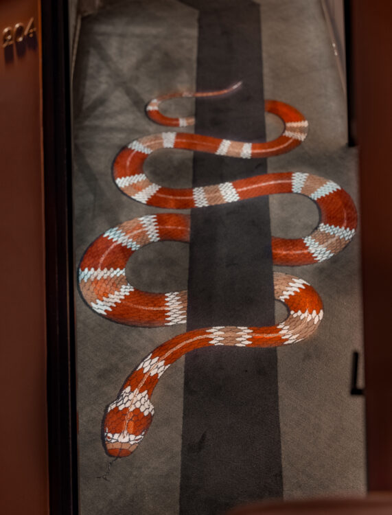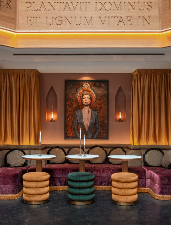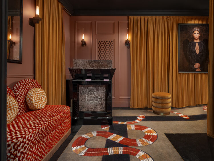 Dès l’entrée, les codes sont posés : le sol en tapis sur mesure tissé main déroule un serpent stylisé – clin d’œil biblique qui invite à pécher avec élégance. Le desk en marbre Calacatta Viola, avec en fond une grille de confessionnal en laiton brossé, pose le décor : une sensualité quasi liturgique, tout en textures. Le canapé aux lignes arrondies invite à s’abandonner dans ce « purgatoire » feutré.