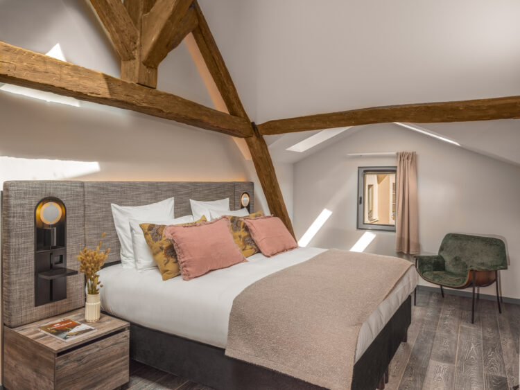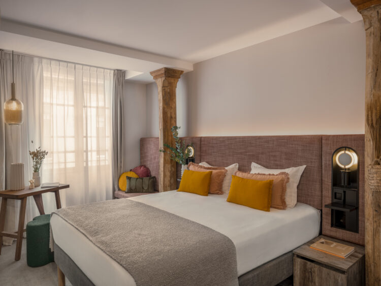 Autour de l’atrium, les coursives historiques en colimaçon ont été consolidées et transformées en circulations principales. Les planchers périphériques ont nécessité un renforcement structurel afin de répondre aux charges hôtelières, tout en respectant les contraintes de gabarit propres au bâti ancien. L’escalier monumental en bois, restauré plutôt que remplacé, devient un élément patrimonial actif dans la composition spatiale.
