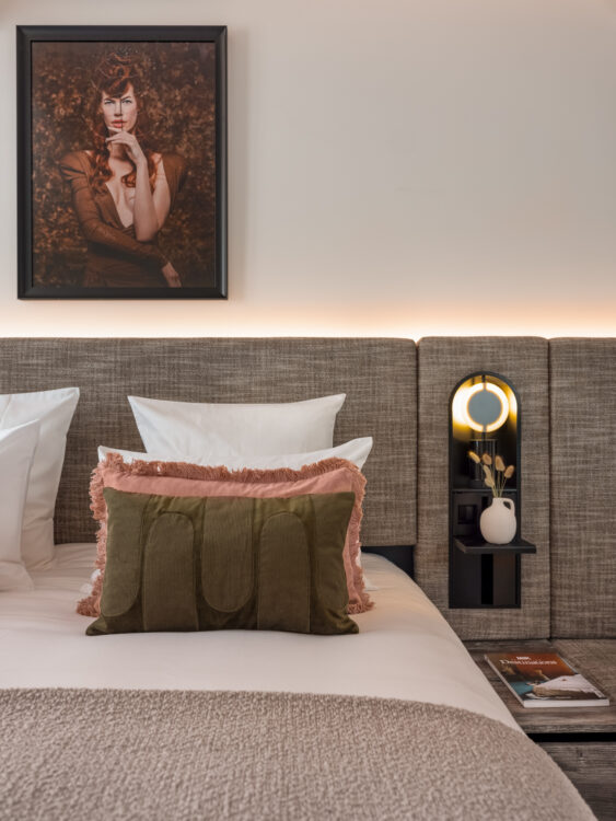 Au-dessus du lit, un portrait de muse veille — Madone moderne ou icône d’avant-garde. La literie, signée Treca Paris, promet un sommeil quasi mystique.