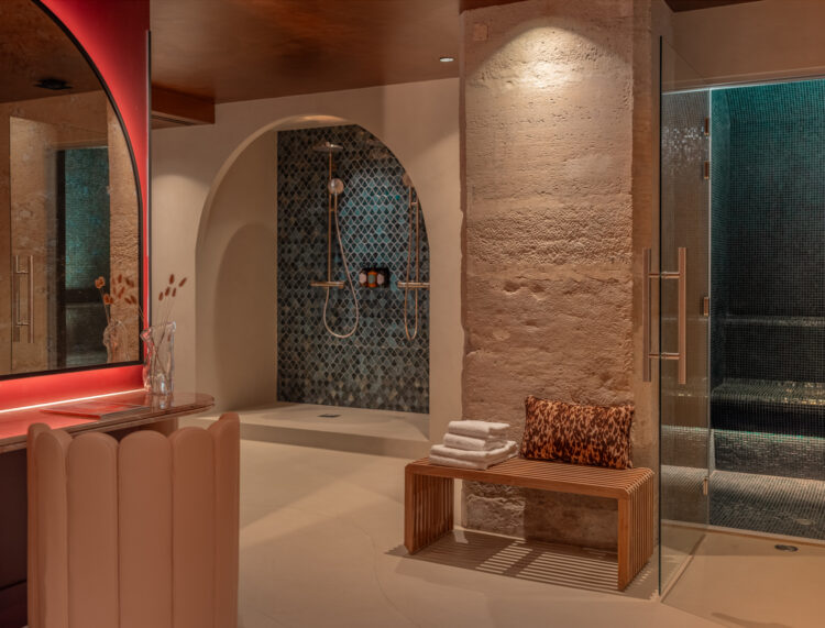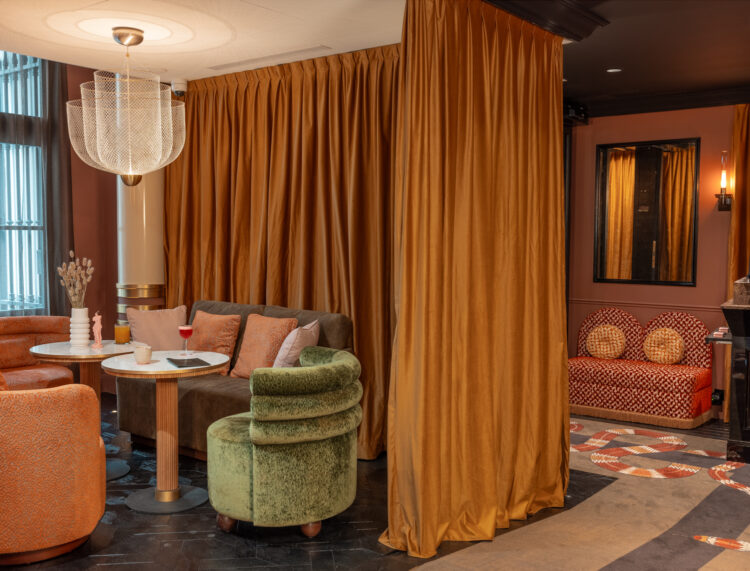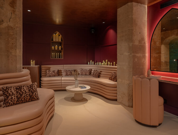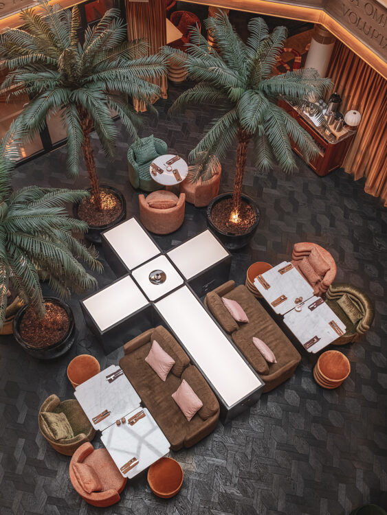 Les salons et loges qui bordent l’atrium sont meublés comme des alcôves secrètes : fauteuils en velours côtelé Pierre Frey, guéridons Gubi Epic Table en travertin, et lampes Santa & Cole à la lumière ambrée. Les murs, poudrés de teintes sombres donnent à la scène une profondeur presque charnelle.
