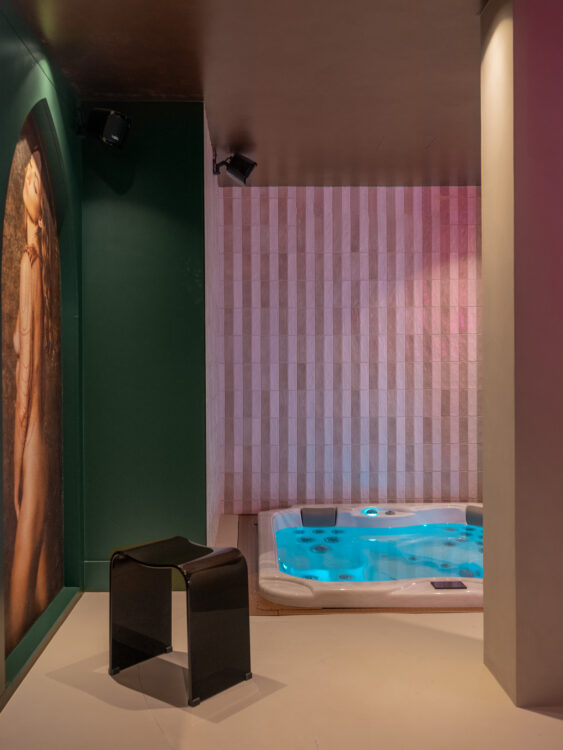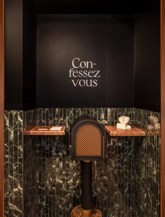 Des enceintes Devialet diffusent des murmures à peine audibles — promesse d’absolution sensorielle. Et, ultime clin d’œil : dans les toilettes, une urne à confession recueille les « péchés » des visiteurs.