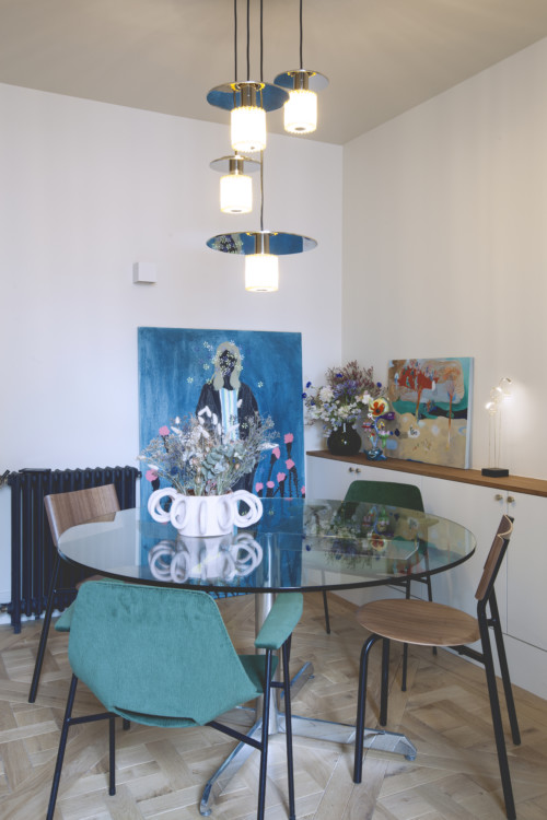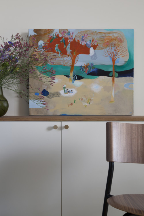 Deux toiles colorées et lumineuses dans une salle à manger. Au fond, l’acrylique sur toile « Dans le Waka #3 » de Moustapha Baïdi Oumarou et à droite, une huile sur toile par Hélène Duclos.