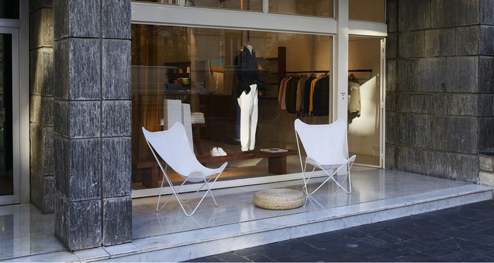 Chez Holiday Boileau, le vintage est partout. Dans les inspirations, sur les cintres et dans le mobilier. Comme cette chaise à l’entrée. Pratique pour poser manteaux, sacs et autres casques et parcourir la boutique à son aise…