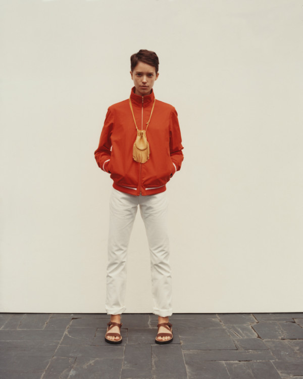 Un pantalon ivoire avec un blouson rouge en ventile et un collier fait en collaboration avec la marque Harpo Paris.