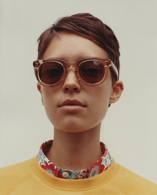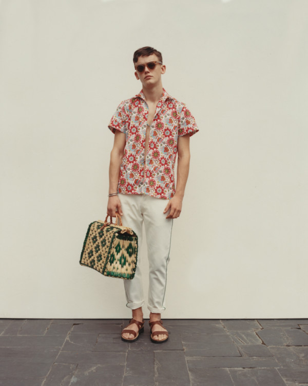 La chemise à fleurs de la saison, le sweatshirt iconique de la marque en jaune et une paire de lunettes de soleil de chez Jacques Marie Mage.