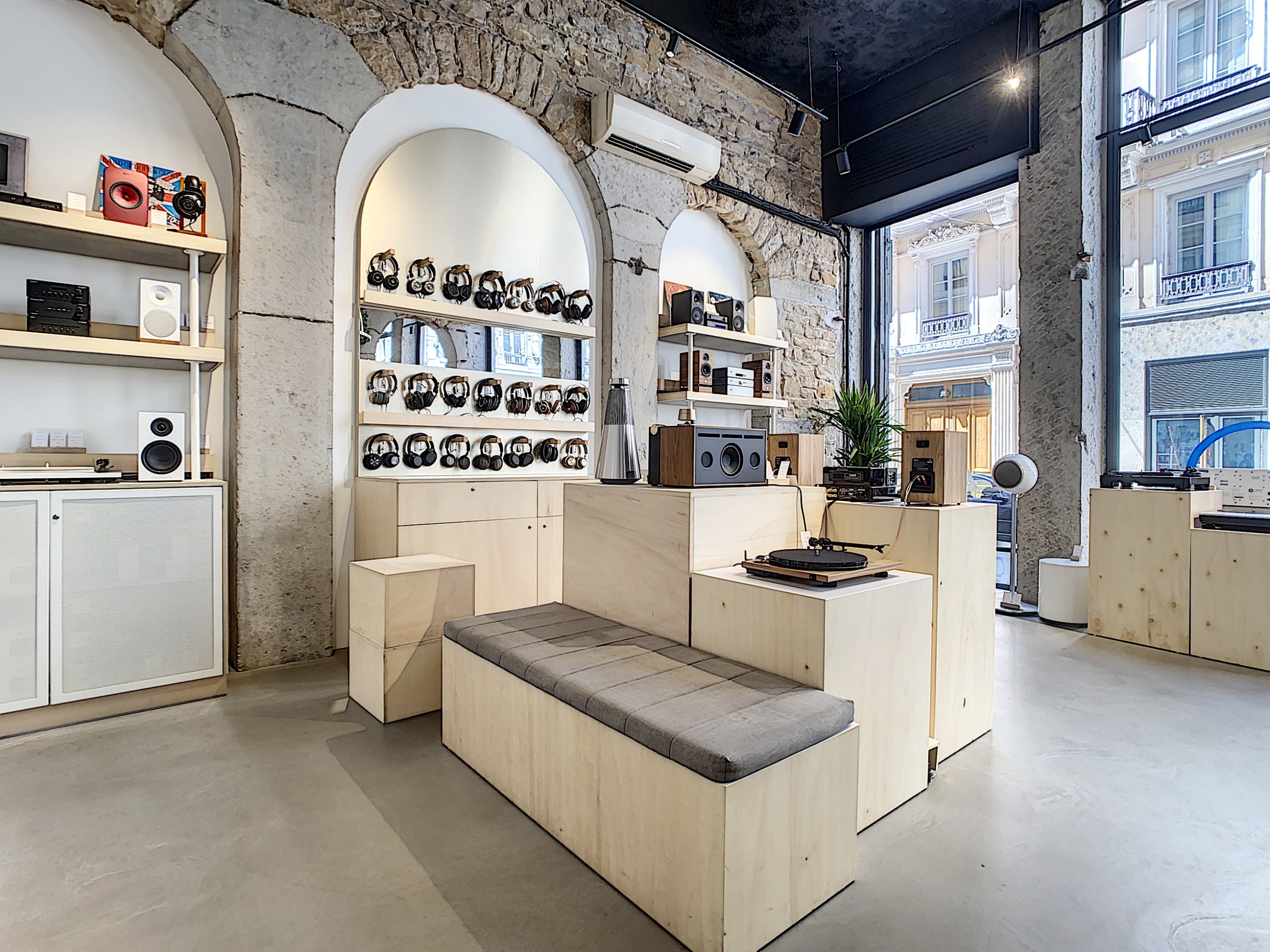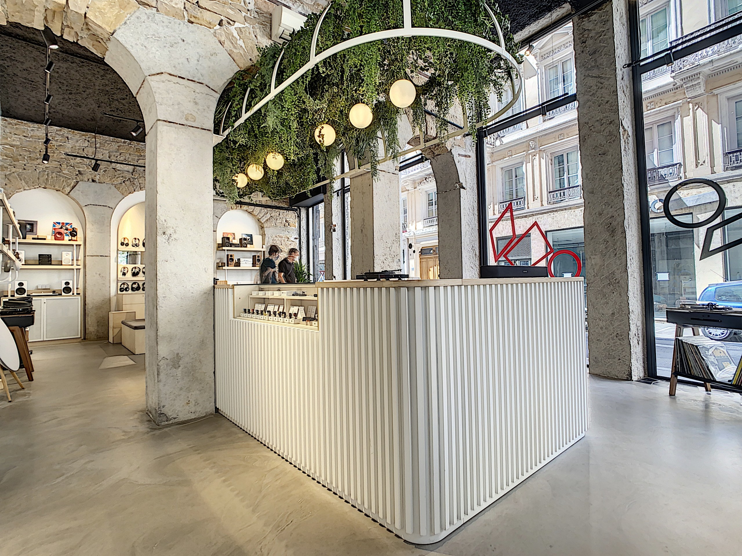 Pour sa seconde boutique, le distributeur de produits audio et hifi a vu les choses en grand : un espace unique dans le quartier le plus tendance de Lyon dédié à l’écoute ! L’enseigne a fait appel à l’architecte Maxime Dolinski qui a mis ses pas dans ceux de Gesa Hansen pour concevoir un nouveau lieu esthétique aux grandes qualités acoustiques. Corners thématiques, bancs d’essais, il y a même îlot sous une canopée végétale pour échanger de façon détendue avec l’équipe. Le tout dans une atmosphère soignée faisant la part belle aux beaux matériaux : béton, bois, verre et vieilles pierres ! Rien n’a été laissé au hasard pour ce cadre rétro-contemporain propice au partage entre passionnés de musique.