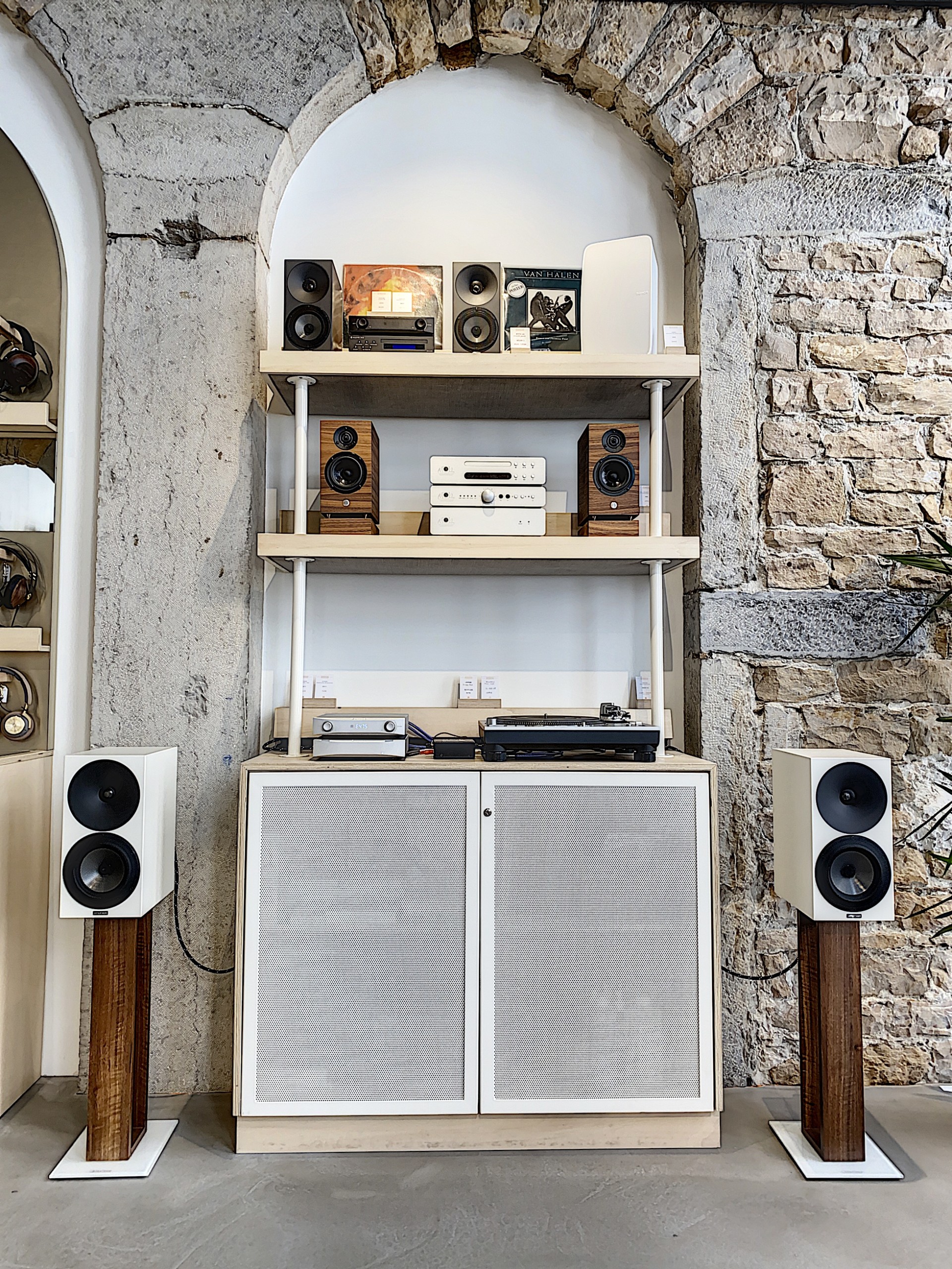 Au fond de la boutique, la pièce montée ! Exposée dans la structure préexistante, plusieurs matériels d’écoute trônent fièrement et vous montrent leurs performances.