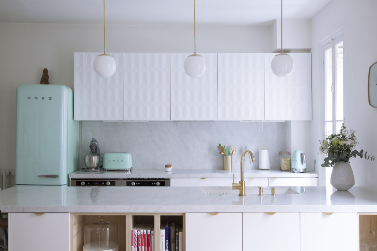 Malin, l’électroménager Smeg choisi dans une couleur mentholée, qui vient joliment dynamiser l’ensemble.