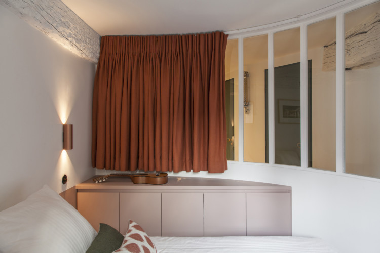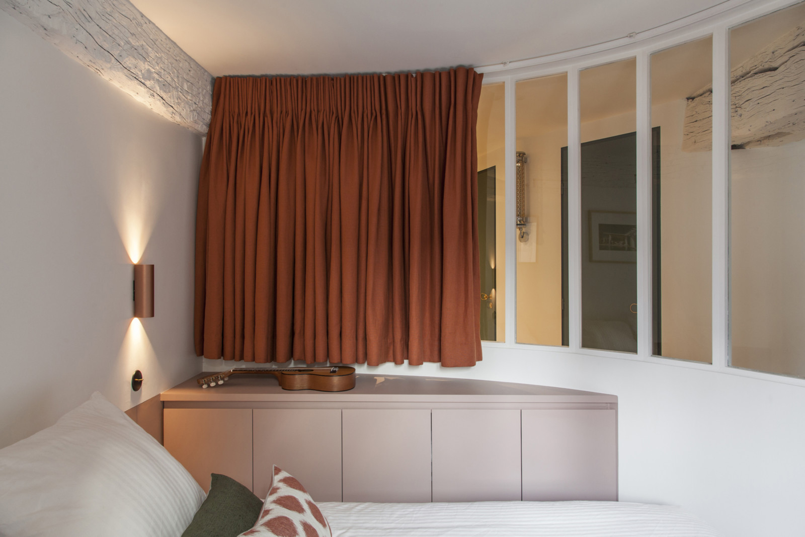 Cette gracieuse verrière imaginée par Studio Ett Hem permet de faire circuler la lumière du jour jusque dans l’entrée et le couloir privés de fenêtres. Avec sa forme arrondie et sa couleur blanche, elle permet la création d’une séparation aussi élégante que discrète qui s’intègre parfaitement à cet appartement ancien.