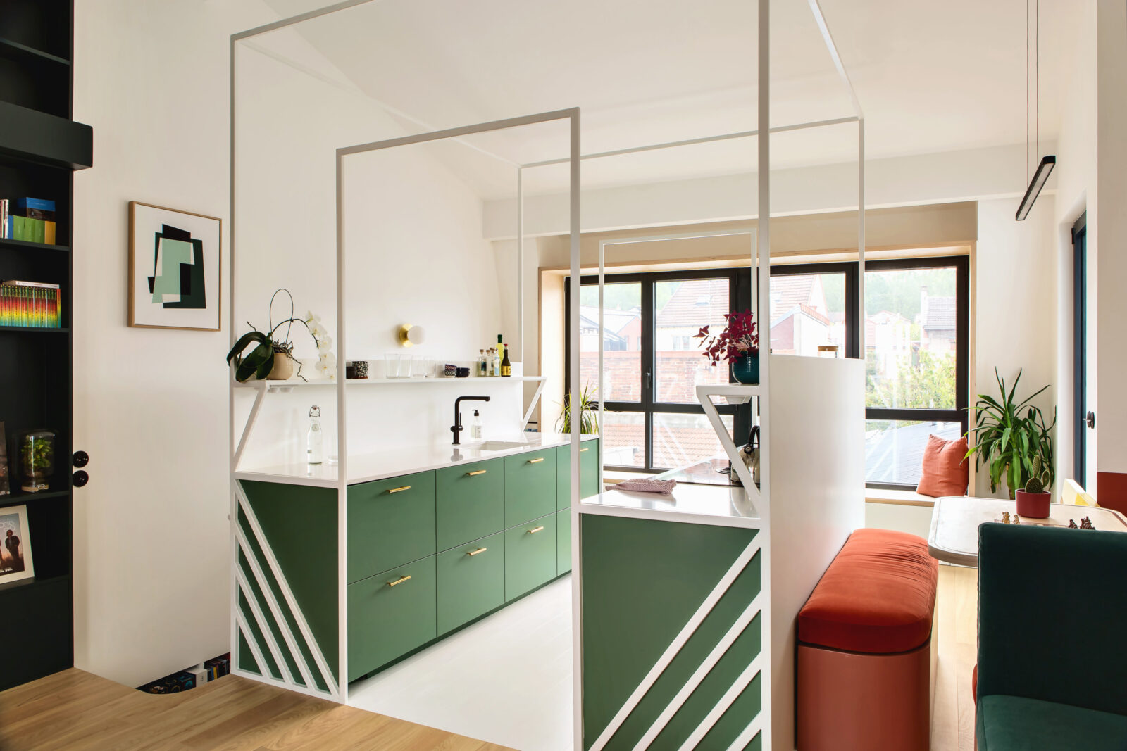 Elles permettent de répondre à deux enjeux principaux : primo, donner du volume à un lieu ; secondo, « zoner » des fonctions. La création d’une pièce dans une autre donne immédiatement une sensation de grandeur au cerveau. Elle permet également d’en réorganiser le plan – y compris quand celui-ci est réduit. Dans un de nos projets (visible ci-dessous), nous avons ainsi pu intégrer dans une même pièce de vie d’une trentaine de mètres carrés un vrai lieu de préparation des repas, une salle à manger, un séjour, un bureau, un accès à une petite terrasse ainsi qu’un escalier – l’appartement étant en duplex.