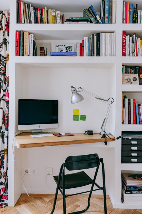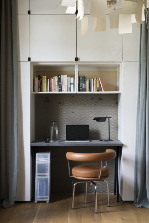 Un bureau qui trouve sa place dans une bibliothèque avec un plateau de biais pour capter la lumière.