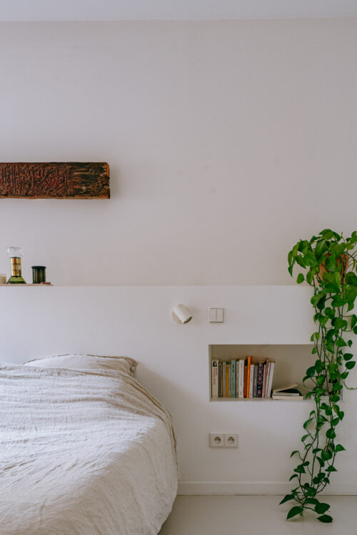 Une table de nuit intégrée à la tête de lit pour donner vie au mur et dégager l’espace.