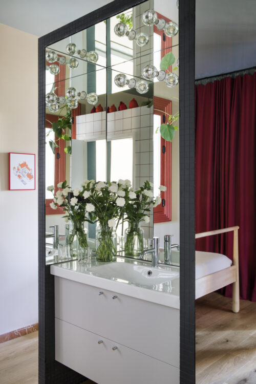 Un totem vasque habillé de miroirs pour créer de la profondeur et cloisonner.