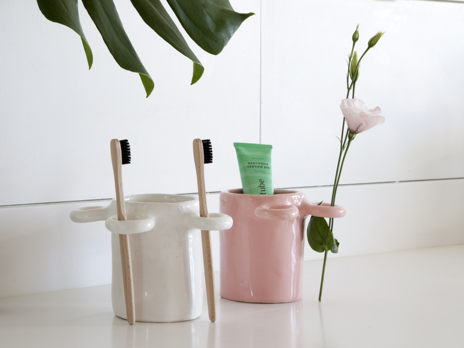 Cette création entretient une parenté certaine avec les vases Poulpes et Méduses de la céramiste. Ne serait-ce que par ses anses rondes. À la différence qu’elles sont placées à l’horizontale pour vous permettre de loger trois brosses à dents de façon autonome. Ainsi, aucun risque de confondre avec celle du voisin ! Il suffit de se souvenir dans quelle anse on l’a placée. Le grand récipient central offre une place généreuse pour accueillir plusieurs tubes de dentifrices ou autres crèmes et aussi quelques brosses supplémentaires ! Pour une composition d’ensemble qui apportera peps et originalité à votre salle de bains.