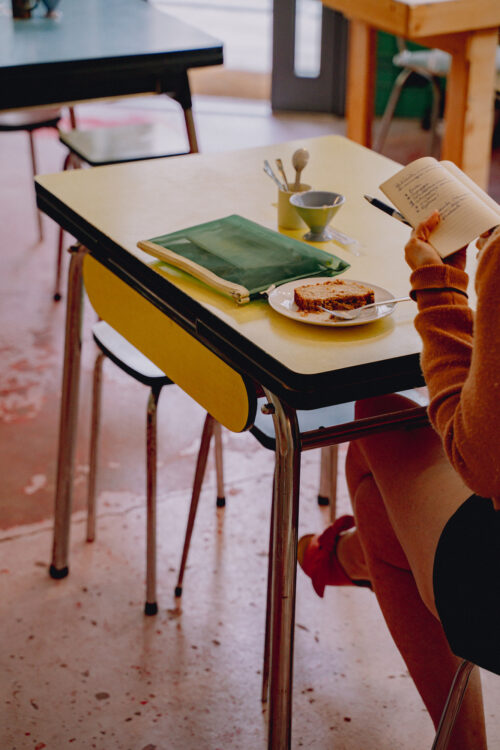 Je me réveille assez tôt. Soit j’ai le temps de lire un peu à la maison, soit je file à la librairie. J’aime y être avant l’ouverture, prendre un café tranquille avec les équipes… La Régulière accueille aussi un chat, il faut prendre le temps de lui donner à manger, de lui faire des câlins… J’apprécie toujours la demi-heure avant l’ouverture. Quand la boutique ouvre, on reçoit des cartons non stop, on passe notre temps à répondre à des mails, à mettre des livres en rayon. C’est un job très physique. Les soirs d’évènements, on ferme à 21 ou 22 heures, mais ça vaut le coup.