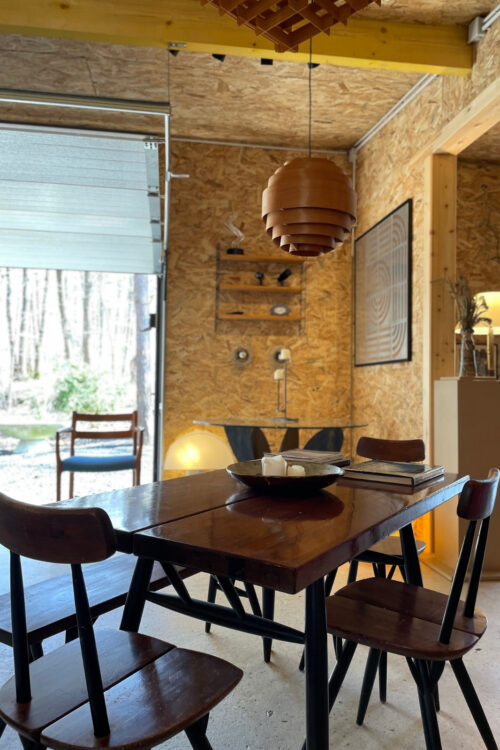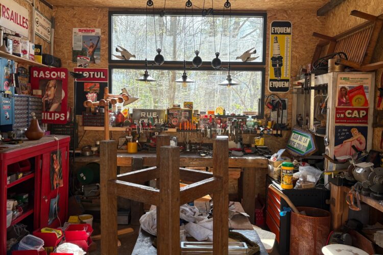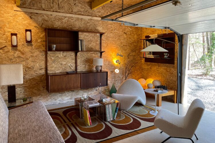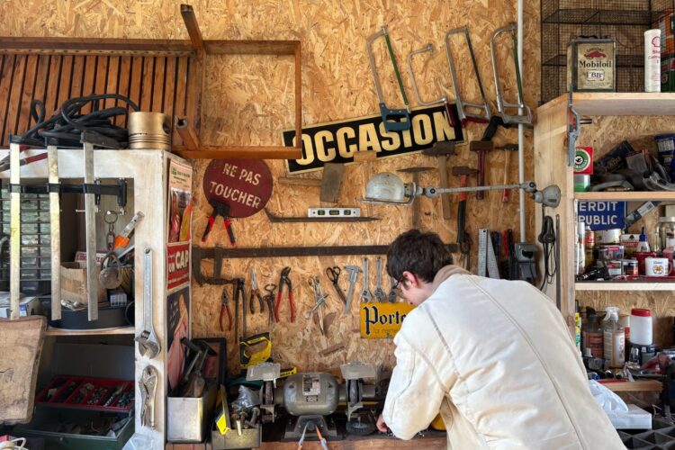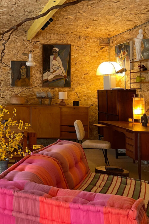 Quand je me suis lancé, j’ai commencé avec un conteneur maritime. Ouvrir une boutique dès le départ impliquait beaucoup de frais et représentait un vrai challenge, donc j’ai préféré développer d’abord le digital, Instagram et les plateformes de revente. Petit à petit, j’ai commencé à avoir de plus en plus de pièces. Le showroom est venu dans un second temps, dans d’anciens box de garage situés sur le domaine familial, que j’ai réussi à récupérer et à aménager. C’étaient des espaces très bruts, avec des matériaux et des véhicules stockés à l’intérieur. Quand je suis arrivé, je me suis tout de suite imprégné du lieu. Je me suis demandé s’il valait mieux cloisonner les espaces, mais j’ai finalement choisi de conserver un volume ouvert pour gagner en surface. J’ai aussi remplacé les grandes portes pleines par une porte vitrée pour apporter de la lumière. Le sol est resté brut, avec simplement une résine pour fixer la dalle, et les murs en OSB, que je voulais au départ recouvrir, apportent finalement quelque chose de très chaleureux, en accord avec l’ambiance de la forêt. J’ai toujours vécu ici, donc j’ai beaucoup d’affection pour ce lieu. J’essaie aussi de travailler à l’échelle locale, autant avec mes clients qu’à travers le sourcing des pièces, que je chine surtout dans le 91, le 78 et du côté de Versailles. Aujourd’hui, c’est un véritable lieu d’expression et de rencontre. J’y reçois mes clients, mes amis et j’y fais venir mes artisans. J’y passe beaucoup de temps, avec mon atelier juste à côté, et j’aime y créer des ambiances en mélangeant les styles et les époques. Avec le poêle à bois, l’hiver, certains pensent même qu’ils sont chez moi… alors que tout est à vendre !