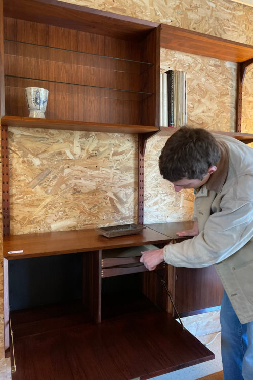 Je peux te citer l’aspect souvent avant-gardiste du design : un objet en avance sur son temps. Le designer crée une silhouette, un système ingénieux, qui va ensuite en inspirer beaucoup d’autres. Par exemple, j’ai ici le système mural du designer danois Poul Cadovius. À la fois très simple à monter et très solide, il repose sur des barres fixées au mur, auxquelles viennent s’accrocher différents éléments modulables. Les caissons et les étagères tiennent grâce à de petites fixations en bois placées en biais. À première vue, on se demande comment ça peut tenir, et pourtant, c’est très ingénieux : le poids ne s’exerce pas frontalement sur le mur. Je pense d’ailleurs que ce principe a inspiré de nombreux systèmes par la suite.