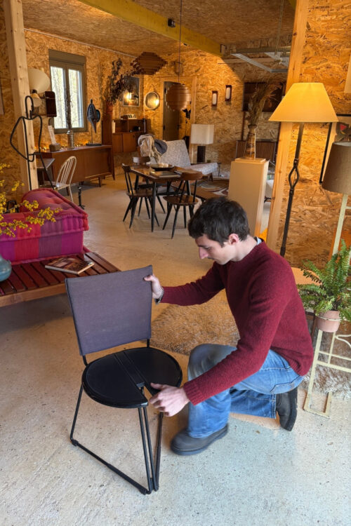 Pour notre génération, le digital est partout et, contrairement à ce qu’on pourrait croire, il a toute sa place dans le métier d’antiquaire. Aujourd’hui, on vend sur les réseaux sociaux et sur des plateformes de revente, ce qui permet de toucher une clientèle bien plus large. Dans mon cas, mon showroom est au fond d’une forêt, sans vitrine sur rue, et pourtant je vends à Paris, dans toute la France, en Europe, et même jusqu’au Japon. Il faut bien que le métier se perpétue, et je suis la preuve qu’il y a aussi de jeunes antiquaires, même s’ils restent rares. Moi, je ne viens pas d’une famille de marchands, mais j’ai toujours baigné dans la décoration, le mobilier vintage et la brocante avec mes parents. J’ai donc toujours eu l’œil. Après le lycée, j’ai commencé des études de mode, puis je me suis un peu cherché. C’est à ce moment-là que mon goût pour la chine, le vintage et le design est revenu. J’ai recommencé à aller en brocante par moi-même, puis j’ai rencontré un antiquaire d’une trentaine d’années, Alexandre, qui m’a appris les ficelles du métier. C’est là que c’est devenu une vraie passion, notamment pour les courants du XXe siècle qu’il couvrait. Toute cette documentation, les connaissances, le lien avec le client : tout ça m’a tout de suite plu. Ensuite, je me suis lancé à mon compte, et ça fait maintenant trois ans que je fais ce métier.