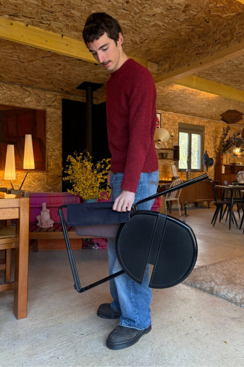 On trouve quand même du mobilier adapté aux surfaces compactes parmi les pièces du marché du XXe siècle. Ici, j’ai le Mah Jong de Roche Bobois, dessiné par Hans Hopfer : c’est un canapé modulable à volonté, composé de dalles en tissu et en mousse simplement posées les unes sur les autres. Avec un module en plus, ou en jouant avec celles du dessous, on peut en faire une sorte de grand lit double, presque comme un tapis vivant. Mais c’est vrai qu’on a souvent affaire à des pièces plutôt imposantes dès qu’on touche au haut de gamme. J’ai aussi cette chaise pliante noire, italienne, de Gaspare Cairoli pour l’éditeur Seccose. C’est une chaise d’appoint plutôt confortable. En plus, elle est légère et, avec sa partie en tissu, elle ne prend pas de place du tout.