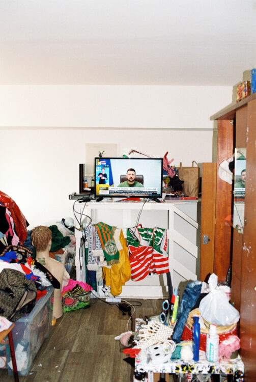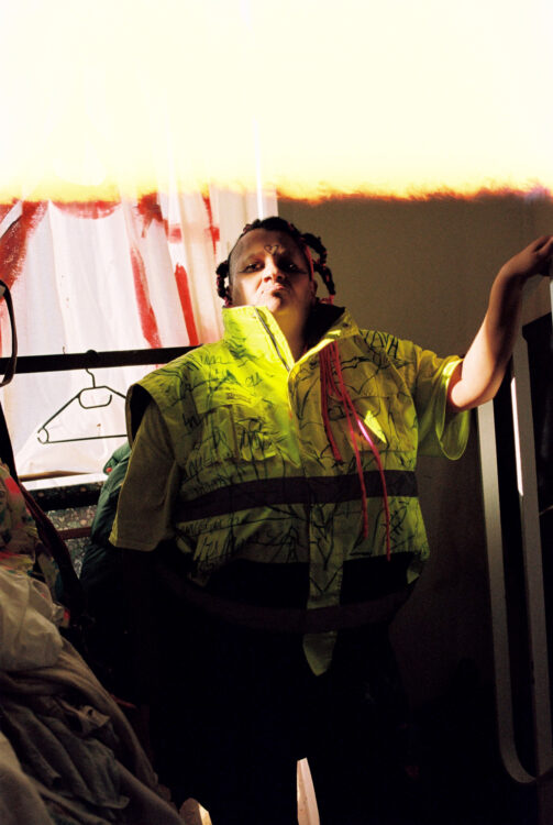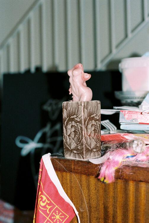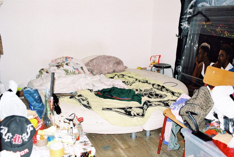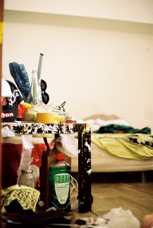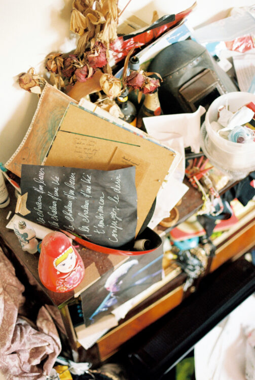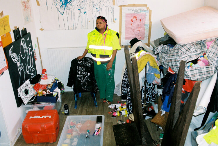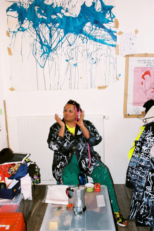 Nous nous trouvons dans mon atelier où j’habite la plupart du temps avec Léontine, mon compagnon. Je suis arrivée ici cinq jours avant le premier confinement, ce qui a mis tout de suite une ambiance particulière dans cet espace qui se trouve à côté de la gare Montparnasse, en bordure des voies. Donc c’est aussi une ambiance très spéciale pour ça. Il y a des artistes qui n’ont pas voulu habiter ici. Moi, je trouve ça très poétique d’être autour du départ, de l’arrivée, des rails. C’est la première fois depuis longtemps que je ne suis pas aussi nomade que j’ai pu l’être. Ça faisait des années que je n’avais pas eu mon nom sur une boîte aux lettres. Ici, c’est le nid, mon nid d’amour, mon endroit pour travailler, pour me reposer. C’est mon endroit pour dormir aussi. Je n’étais pas quelqu’un qui dormait beaucoup avant ; je dors beaucoup plus aujourd’hui.