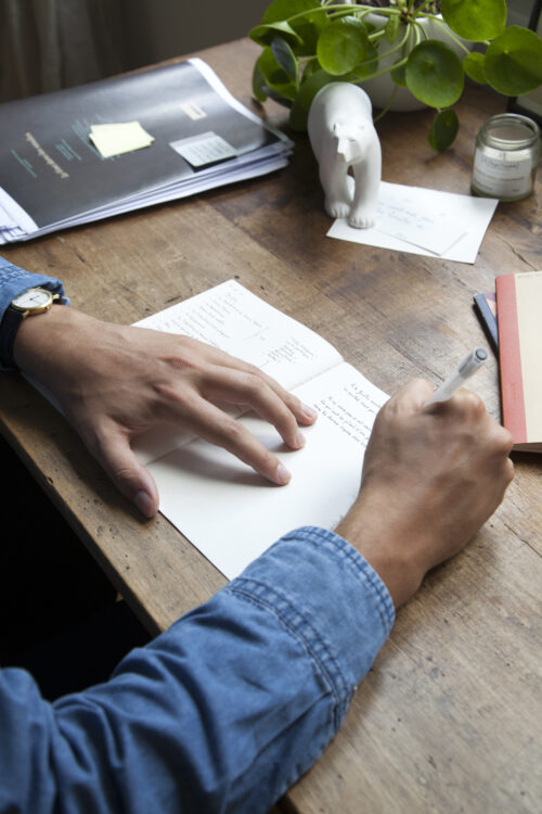 Quand j’arrive dans la petite rue calme du 14e arrondissement où Clément et sa copine Alix habitent, je suis, comme d’habitude, en retard. Heureusement, Fabienne, notre photographe en cheffe, est là depuis un bout de temps déjà pour tirer le portrait de ce jeune couple moderne et photographier ce qui m’intéresse particulièrement, le bureau d’un écrivain.