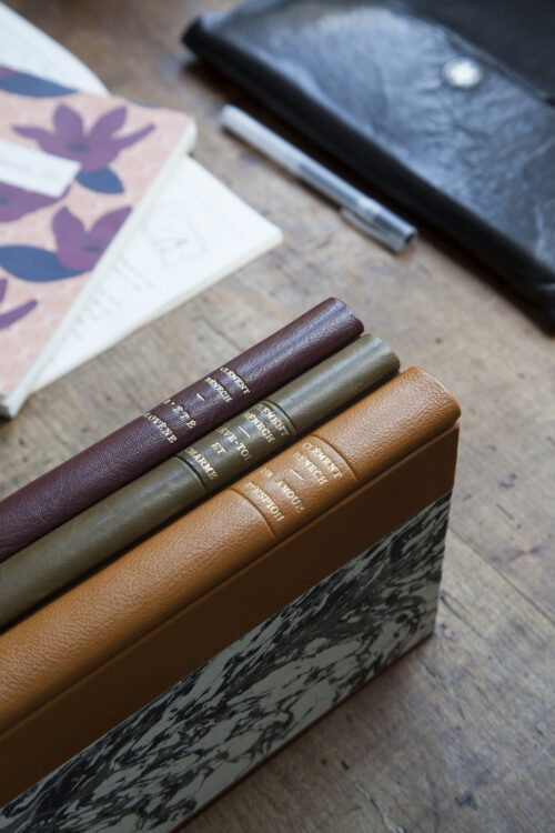 Oui, pour marquer le coup et pour avoir mon exemplaire d’auteur, qui ne ressemblera pas à ceux qui sont dispersés dans le monde. J’ai choisi des couleurs de reliures qui se mangent : prune, olive et melon. Et pour mon essai, je l’ai fait chez un petit relieur à côté de la maison, j’ai choisi framboise.