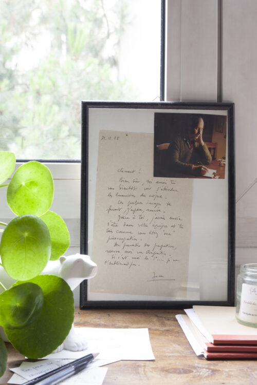 Oui, j’écris beaucoup, notamment quand j’ai fini le livre d’un auteur vivant. Quand j’ai bien aimé, souvent je lui écris un petit mot. C’est un bureau qui a appartenu à mon grand-père. Il était commercial dans le papier. Il faisait beaucoup de voyages en Europe pour trouver de nouveaux papiers, de nouveaux marchés. Il écrivait aussi un peu. Il avait publié une ou deux nouvelles dans des revues et aussi des illustrations. C’est un bureau qui est face à une baie vitrée.