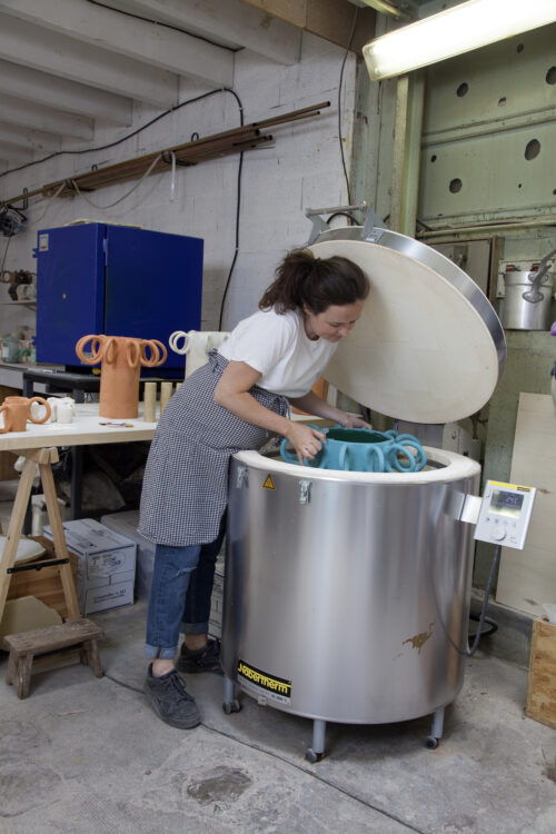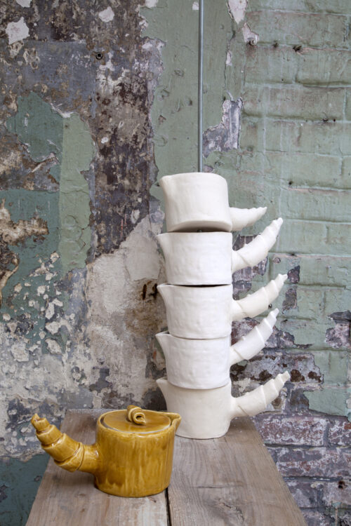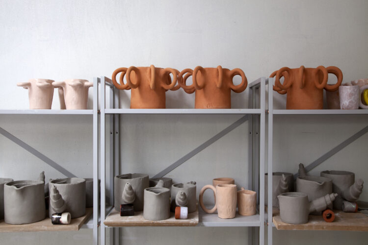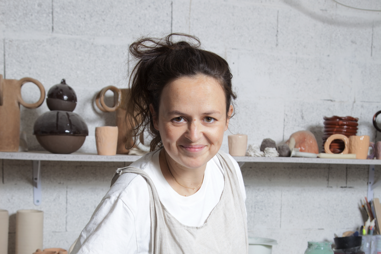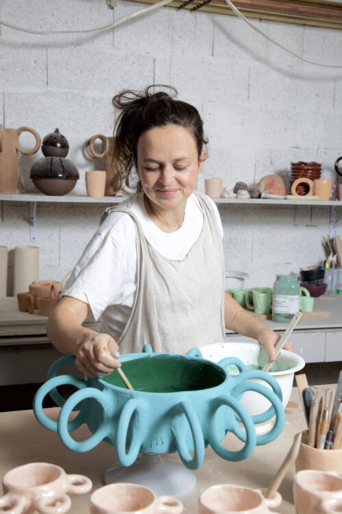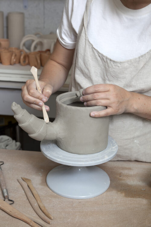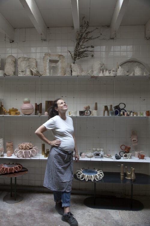 Ici, Pia est en train de terminer le modelage d’une de ses fameuses théières Croissant éditées par French Cliché qui font fureur à la Boutique de Loulou, le concept store de la Samaritaine.