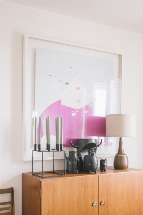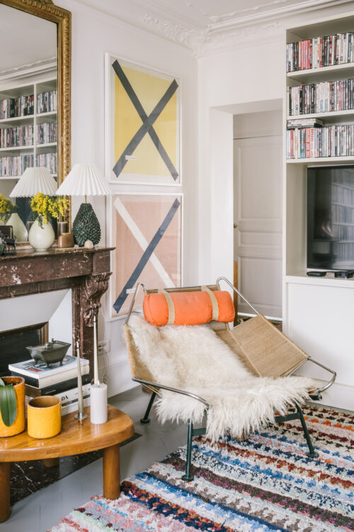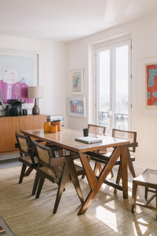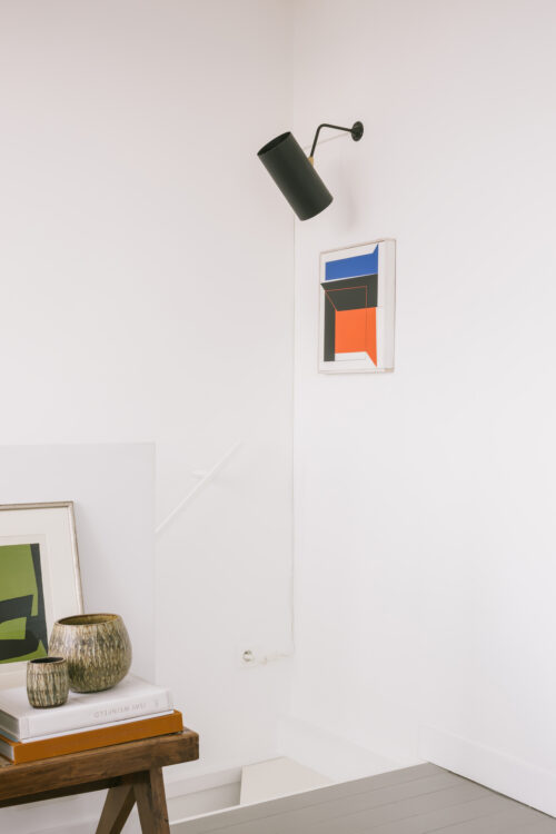 Kim : Non, parce que j’ai beaucoup plus d’envies que d’argent (rires) ! Les vases en céramique danoise que tu peux voir ici et là, c’est un lot que j’ai acheté pour 150 euros. J’acquiers au fil des occasions, comme ces têtes de taureau ou les pièces orange, sous l’escalier, qui sont des céramiques françaises signées des frères Cloutier. Chaque saison, j’ai aussi choisi de m’offrir un objet, une œuvre. Comme ce tableau blanc et jaune de Ludovic Philippon, qui me rend heureux… Et puis on ne se meuble pas qu’avec des pièces design ! La table dans le bureau de Sergio, c’est une planche de bois brésilien qui pèse une tonne, récupérée sur un salon Maison & Objet.
