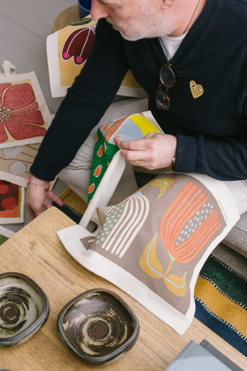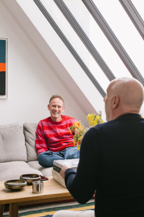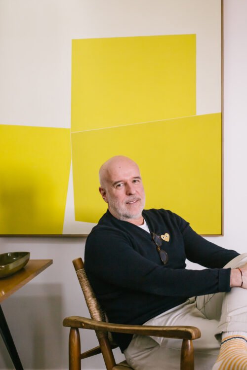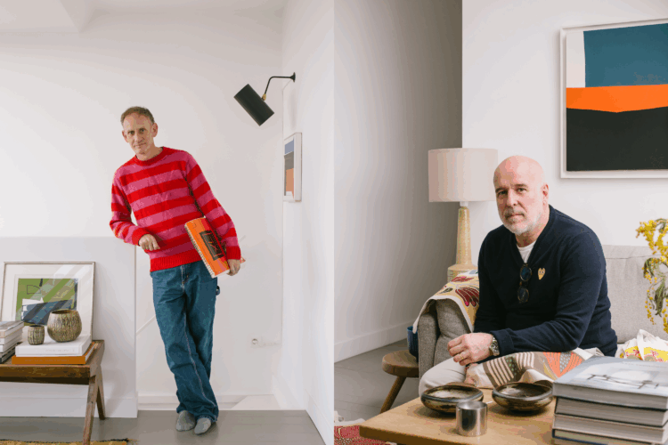 Kim est danois, Sergio brésilien. Le couple vit depuis leur rencontre en 2008 – date qu’ils se sont fait tatouer – dans un très joli appartement montmartrois. Joli… simple, aussi. Ici, pas d’ascenseur, juste une cage d’escalier pas très grande et qui sent bon la cire, aux marches légèrement de guingois patinées par le temps. Une étonnante chaleur irradie de l’appartement dès qu’on en franchit le seuil : celle de ses habitants, qui vous accueillent à bras ouverts, comme de vieux copains. Pas de photo perso aux murs (il faudra nous plonger dans l’album du couple pour les dénicher), mais des pièces iconiques, de très belles céramiques, du mobilier signé. Moins muséal que cocoon, l’endroit est surtout le reflet d’une existence passée à la poursuite du beau, comme on recherche une essence rare. Car la collection personnelle du styliste de mode (Kim) et du designer textile (Sergio) ne répond à aucune logique comptable. Entre le très poétique petit bureau de Sergio, une applique Serge Mouille et des toiles qui les font vibrer, un sentiment puissant domine les lieux : celui d’une infinie liberté.
