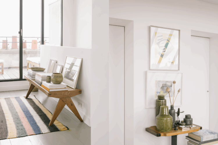Une récente Visite Guidée nous avait permis de faire connaissance avec leur appartement. D’autres auraient pu choisir de lui attribuer une décoration ostentatoire, ampoulée… Eux ont opté pour le dépouillement. De ce bien réparti sur deux niveaux, à la terrasse de seulement 5 mètres carrés mais avec une vue inouïe sur Paris, de ces pièces de surface souvent modeste, ses propriétaires ont fait une ode à la simplicité.