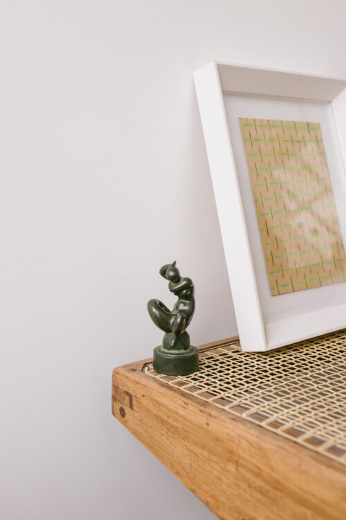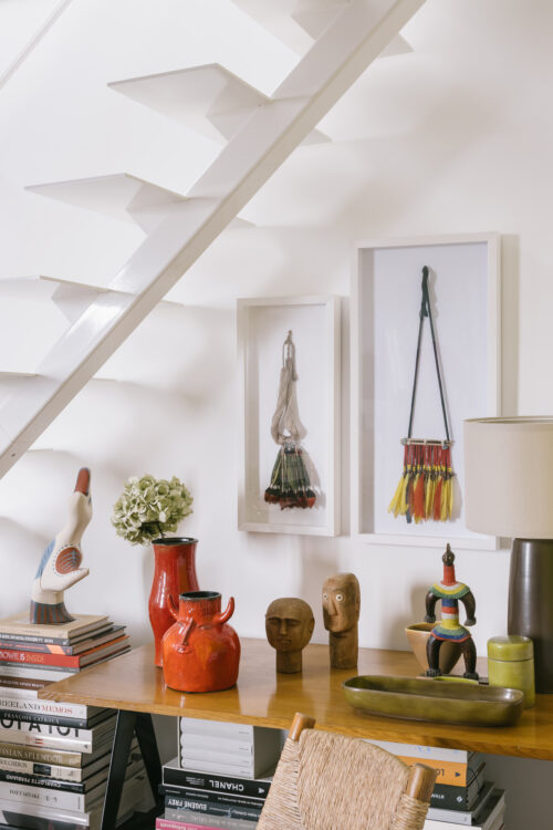 Kim : C’est surtout lié à ma culture et à celle de Sergio. Un intérieur, c’est un peu comme une histoire qu’on se raconte, non ? Les colliers sous l’escalier, je les ai achetés lors de notre premier voyage au Brésil, peu après notre rencontre. Et ça [il désigne une petite sculpture au même endroit], c’est un morceau de bois que Sergio a peint pour moi. Il a un côté « picassoesque »… Oiseau ou dauphin ? On ne sait pas trop. Il est drôle, non ? J’aime aussi les choses improbables, comme la biche de la Manufacture royale de Copenhague dans notre chambre. Quand tu la vois, tu te dis : « Merde, jamais je ne mettrais ça chez moi » (rires) ! Elle ressemble à un cadeau qu’on aurait fait à un directeur de banque dans les années 1960-70… En même temps, elle a un truc bien à elle, un vrai charme.