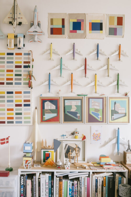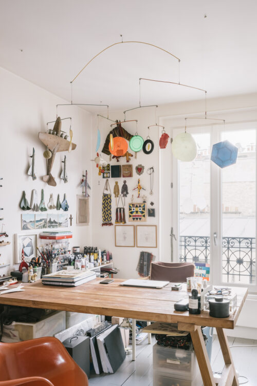 Sergio : C’est ma pièce à moi, la seule où ça peut vraiment être le bazar (rires). Mon espace libre ! La collection d’avions aux murs, c’est parce que je suis fou amoureux du Concorde. Le mobile suspendu au plafond a été acheté sur un marché au Bénin, à un homme qui faisait des pièces uniques avec ce qu’il trouvait dans la rue : couvercles de Tupperware ou balles de tennis… On dirait un Calder africain ! Il est vieux, le plastique craque alors je le restaure avec du scotch. En fait, il vit sa vie ! (sourire).