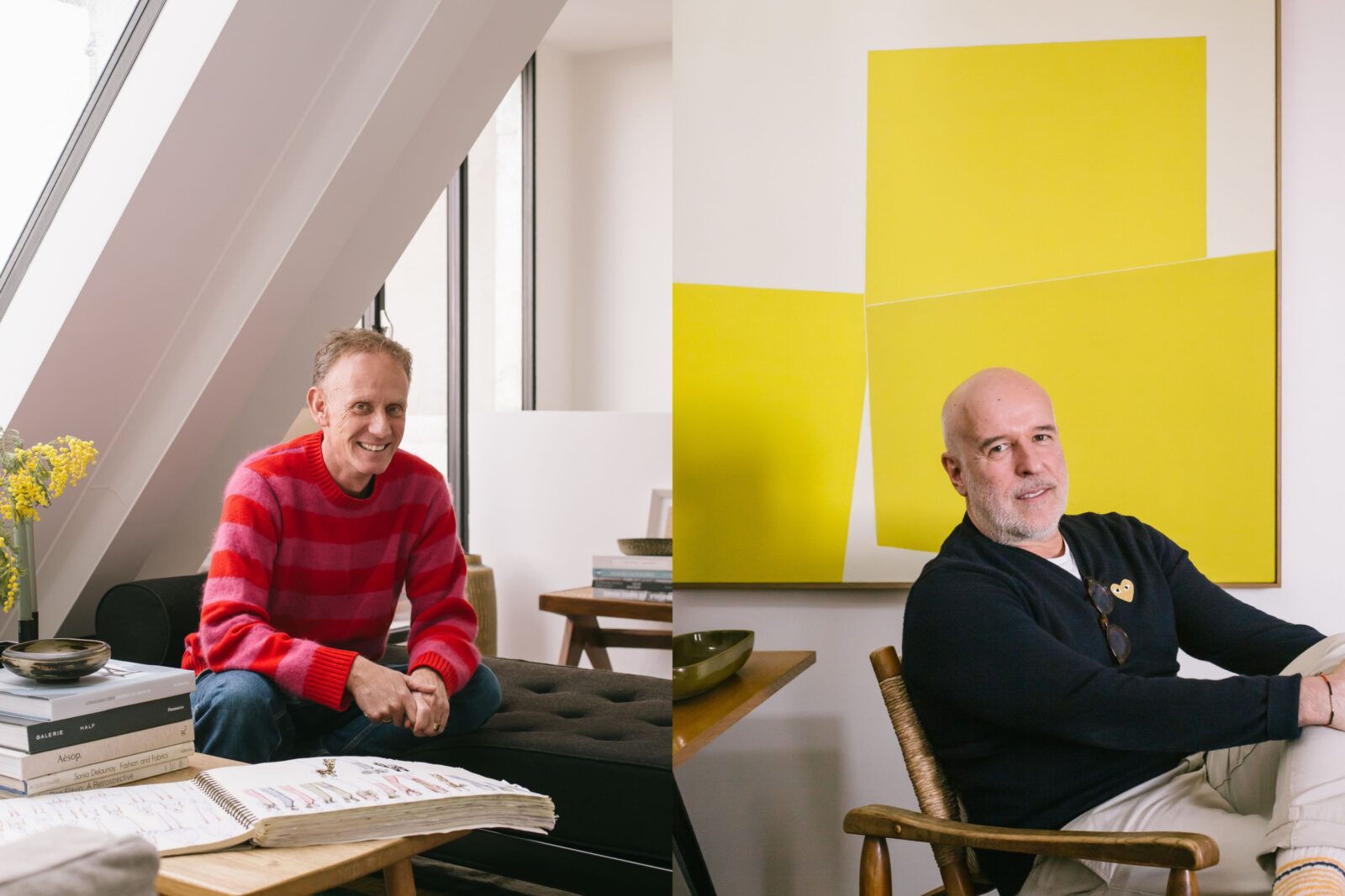 Kim est danois, Sergio brésilien. Le couple vit depuis leur rencontre en 2008 – date qu’ils se sont fait tatouer – dans un très joli appartement montmartrois. Joli… simple, aussi. Ici, pas d’ascenseur, juste une cage d’escalier pas très grande et qui sent bon la cire, aux marches légèrement de guingois patinées par le temps. Une étonnante chaleur irradie de l’appartement dès qu’on en franchit le seuil : celle de ses habitants, qui vous accueillent à bras ouverts, comme de vieux copains. Pas de photo perso aux murs (il faudra nous plonger dans l’album du couple pour les dénicher), mais des pièces iconiques, de très belles céramiques, du mobilier signé. Moins muséal que cocoon, l’endroit est surtout le reflet d’une existence passée à la poursuite du beau, comme on recherche une essence rare. Car la collection personnelle du styliste de mode (Kim) et du designer textile (Sergio) ne répond à aucune logique comptable. Entre le très poétique petit bureau de Sergio, une applique Serge Mouille et des toiles qui les font vibrer, un sentiment puissant domine les lieux : celui d’une infinie liberté.