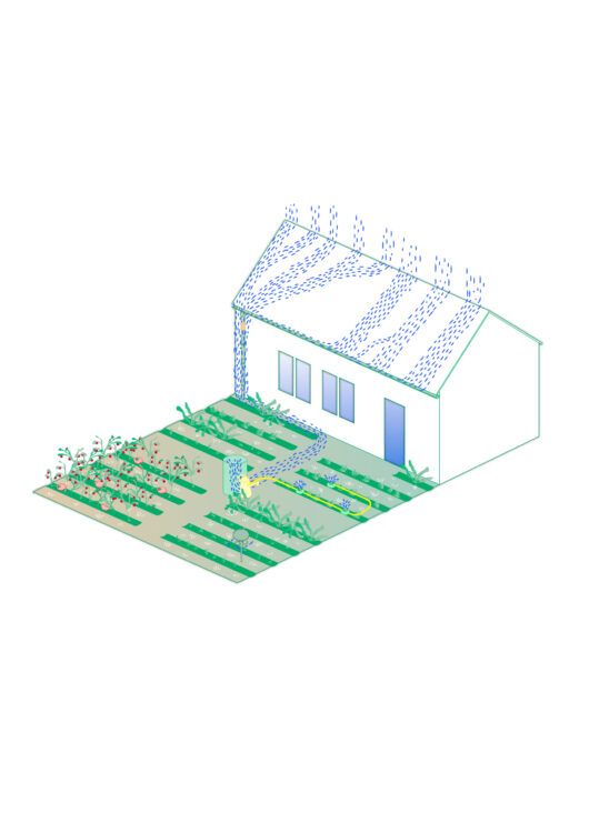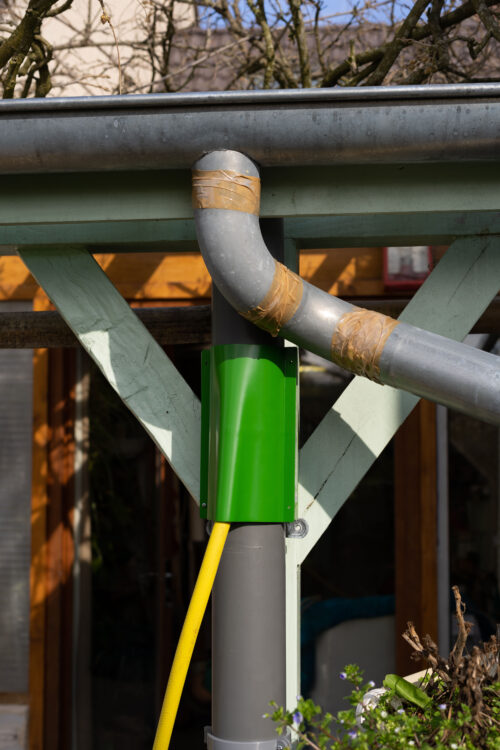 Fixé sur la gouttière d’une habitation, il recueille l’eau de pluie issue du toit et invite à s’affranchir partiellement du réseau d’eau potable. L’eau ainsi stockée est ensuite acheminée vers le potager par la seule force d’une chute de trois mètres, sans réseau, sans énergie et sans effort.
