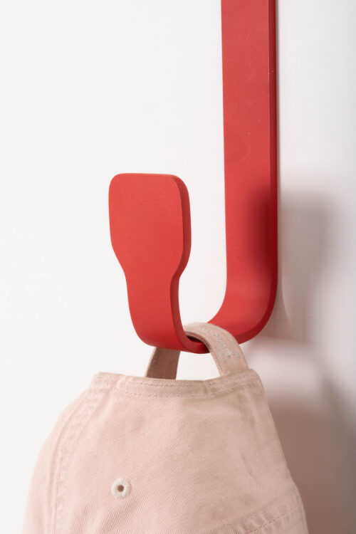 Provenant de la même collection, un porte-manteau constitué d’une simple patère à deux crochets relie symboliquement, par sa partie inférieure, celle du haut — comme un lien entre les petits et les grands. Un objet bien conçu est-il avant tout un objet qui crée du lien et favorise le vivre-ensemble ? Le design doit-il être un vecteur de collectivité ?