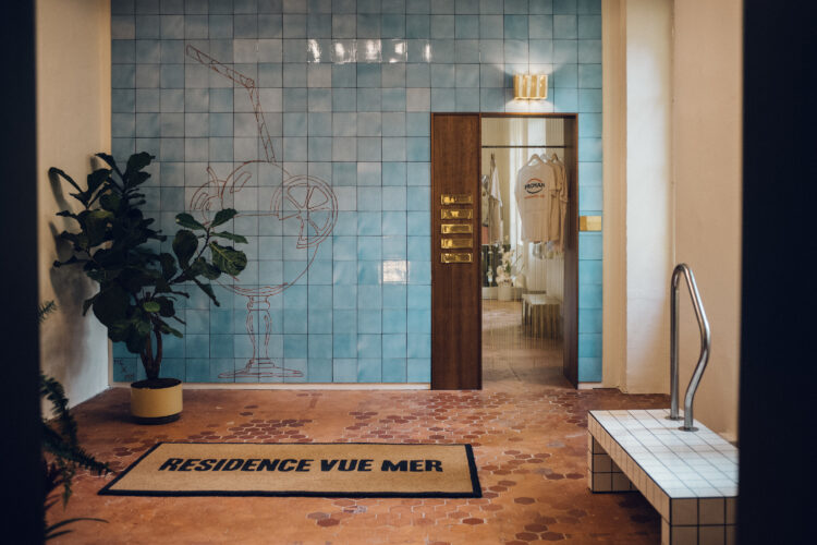 Un grand paillasson tel un cartel légendant l’oeuvre, un module évoquant une possible piscine extérieure comme les « résidence de standing » en comptent tant, un grand mur en faïence sur lequel se découpe une coupe glacée dessinée par Maggy Champsaur, et de belles boîtes aux lettres en laiton. Dès le hall d’accueil, tous les codes sont posés, et notre curiosité éveillée. Marion Mailaender nous propose de pousser la porte de cet immeuble, transposition poétique de ceux qui ont peuplé son enfance marseillaise.