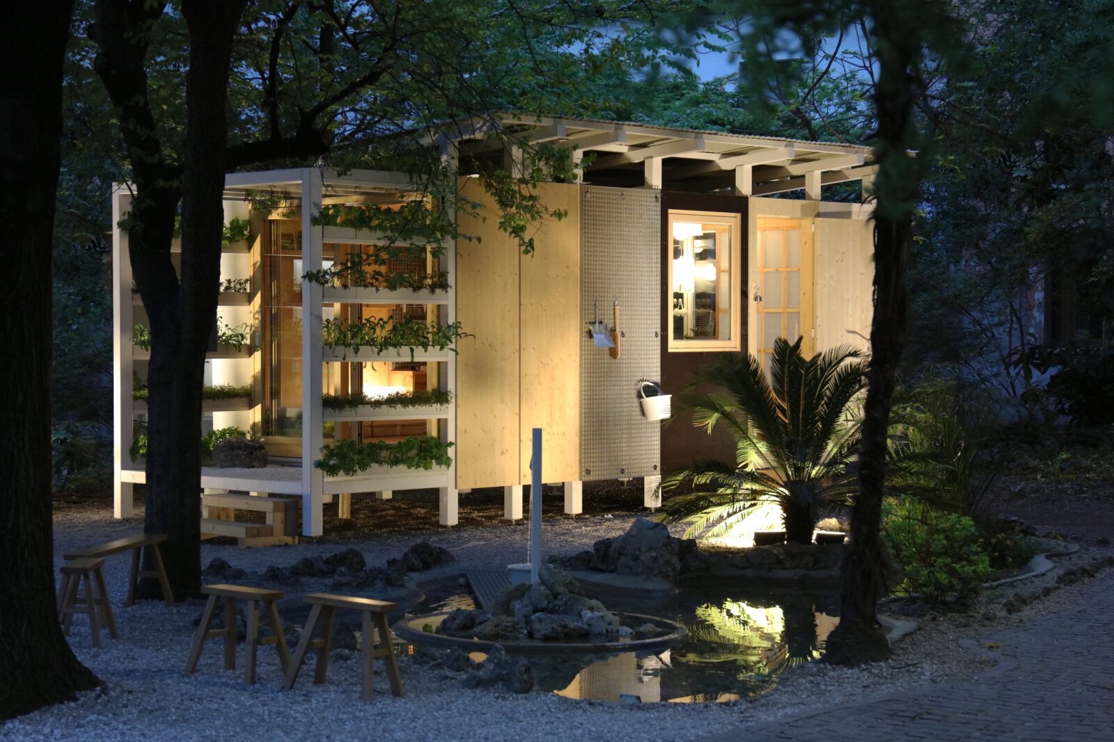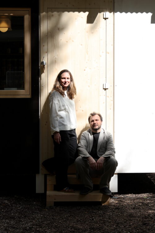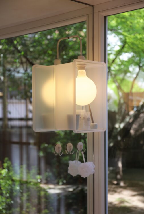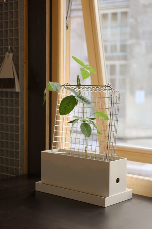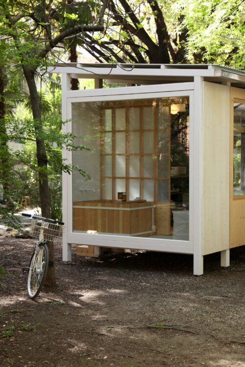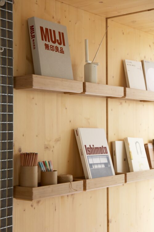 CLAIRE RENARD : Par exemple, pour l’entrée, on a besoin d’un meuble à chaussures, parce que forcément on enlève nos chaussures. Muji propose plein de boîtes aux profondeurs, dimensions et hauteurs variées, qui s’emboîtent et restent parfaitement fonctionnelles. Il ne restait plus qu’à choisir les bonnes boîtes et à trouver le coussin adapté pour le dessus. Mais vraiment, ça s’est fait en boutique. Je vois la patère, la cabane à oiseaux. On avait identifié des objets sur le site, mais après, il y a peut‑être eu quatre propositions de cabane à oiseaux pour Milan. Et, au final, on en a retenu une qui me paraissait la synthèse même de ce module pour oiseaux, parce qu’elle reprenait vraiment cette idée de tranche, comme la maison, avec ce trou qu’on ouvre, et tout était calibré.