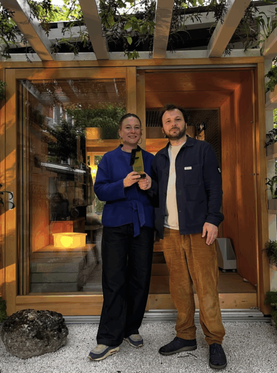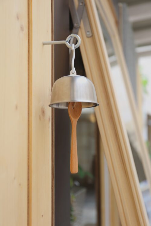 JEAN-SÉBASTIEN BLANC : À la base, on part d’un besoin quand même, c’est-à-dire, on ne fait pas des objets pour faire des objets. On voulait faire une sonnette pour la maison parce que comme il n’y a pas de sas, il y a une proximité, c’est bizarre de voir des gens arriver chez toi comme ça. Tu vas chez Leroy Merlin, ils te vendent un bouton avec une pile, il faut acheter le boîtier, tu mets une domotique à l’intérieur. Pour moi, une sonnette dans mon imaginaire, c’est ding-dong, je suis là. Et donc c’est tout mignon, donc on prend un bol en acier, on prend une cuillère, on commence à se demander comment peut-on faire du bruit, comment créer la petite sonnette ? C’est un objet hyper marrant, mais qui est assez symbolique de notre approche. À Milan, tous les gens qui rentraient dans cette maison utilisaient la petite cuillère sur la cloche et ding-dong, je suis là. Et ça fait vraiment le petit ding-dong qui est charmant, qui est simple, et le petit bruit qui fait du bien.