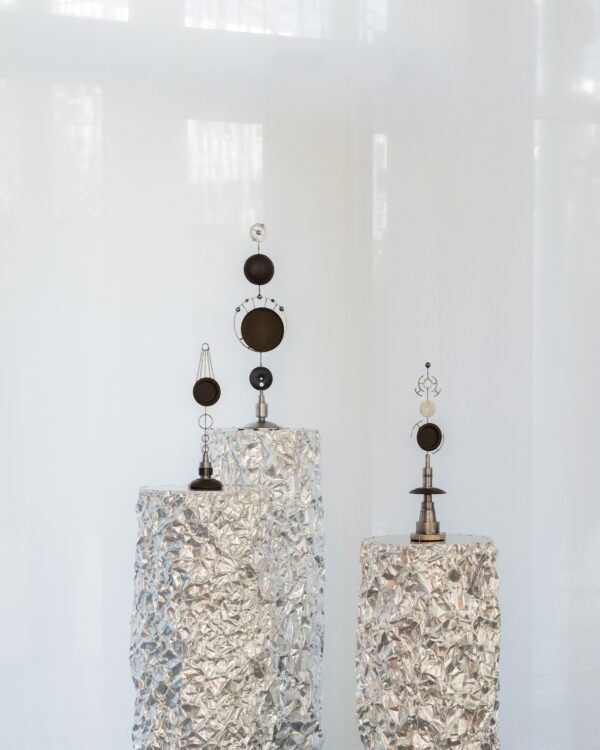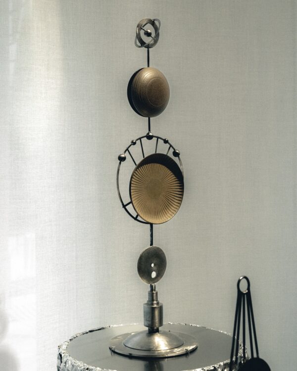 Dans ce quatrième espace, intitulé « Feu (火, Ka/Hi) : Énergie et renouveau », la collaboration entre Clara Imbert et Suzuki Morihisa met en tension deux manières de travailler le métal. Dépositaire du nambu tekki, un savoir-faire japonais de fonte originaire de la préfecture d’Iwate, notamment connu pour ses théières, bouilloires et autres objets du quotidien en fonte, l’artisan a transmis à l’artiste certaines de ses pièces afin qu’elle puisse les prolonger dans une écriture nouvelle. Mené à distance, dans un échange de dessins, d’idées et d’objets, ce dialogue a peu à peu fait émerger une œuvre commune. La rencontre est d’autant plus forte que la fonte et l’acier procèdent d’une même origine, le minerai de fer, tout en répondant à des logiques de transformation très différentes. En inventant des systèmes d’emboîtement pour les réunir sans en effacer les singularités, Clara Imbert fait de cette collaboration un point d’équilibre entre héritage artisanal et expérimentation contemporaine, en parfaite résonance avec l’idée de Ka : celle d’un feu qui pousse la matière jusqu’à ses limites pour lui permettre d’atteindre une forme nouvelle, comme une renaissance.