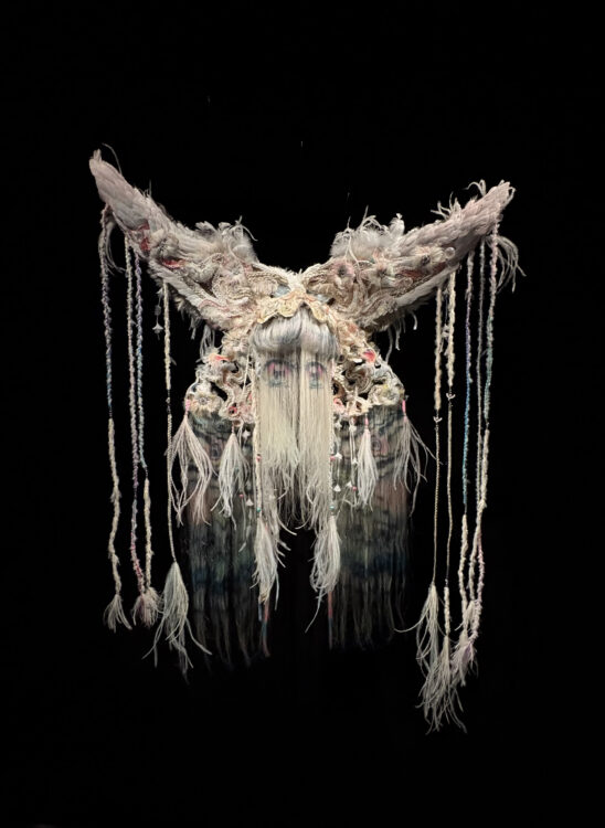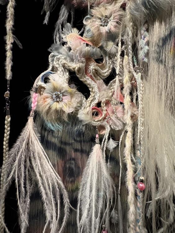 Dans la dernière salle se cache une black box, dissimulée derrière un rideau blanc, où flottent dans l’obscurité des créations polymorphes, à mi-chemin entre la perruque et la sculpture. Ces ovnis visuels sont signés konomad, plateforme créative fondée par Tomihiro Kono, perruquier-coiffeur, et Sayaka Maruyama, artiste visuelle. « Du croquis préparatoire à la réalisation des bases en fil de fer jusqu’à la coloration des cheveux », précise Julie Bessis, coautrice de l’ouvrage de l’exposition ; tout y est pensé comme un travail d’orfèvre. Pour la Galerie du 19M, cinq créations flottantes ont ainsi été réalisées, en collaboration avec le chapelier Maison Michel, l’atelier de broderie Montex, l’orfèvre Goossens et le plumassier Maison Lemarié. Deux d’entre elles ont particulièrement retenu notre attention. La première, Fantastic Moth, évoque, comme son nom l’indique, la présence d’un papillon de nuit, avec ses plumes et ses deux yeux qui nous observent dans la pénombre, reprenant d’ailleurs les codes graphiques du manga. La seconde s’organise en cinq fragments à l’esthétique acide et punk, où des fruits réalisés par la maison Montex semblent hors de contrôle, comme projetés dans une composition dynamitée.