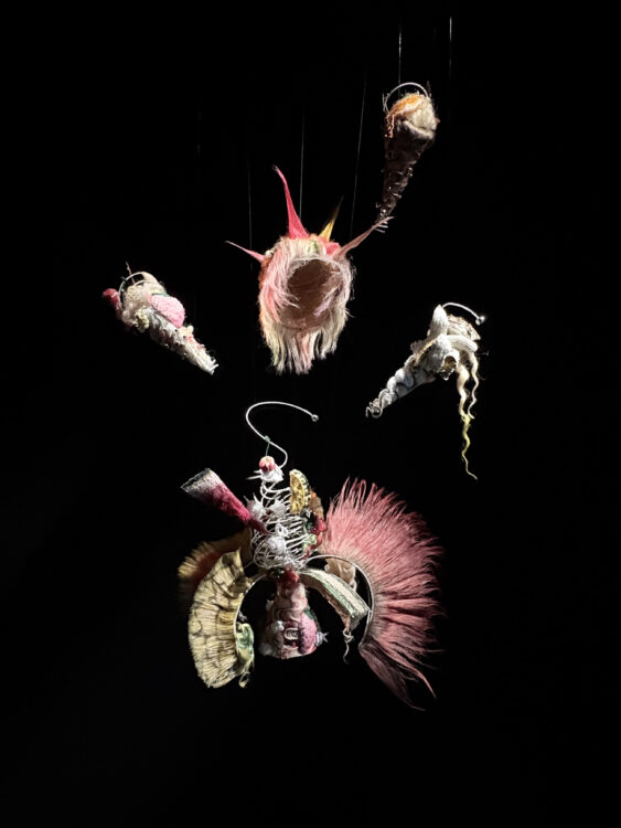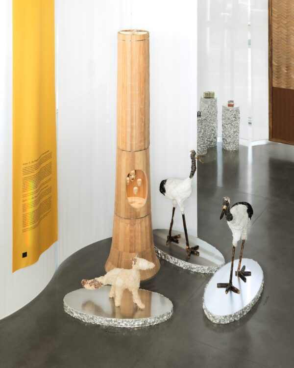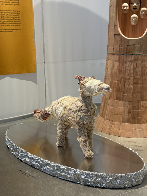 En entrant dans la première salle, l’exposition dévoile son premier fil rouge, intitulé « Terre : Racines et transmission ». Le regard se pose très rapidement sur un renard en tweed, accompagné de deux grues. Réalisés par Julian Farade à partir de tissus patchwork créés par Lesage, ces animaux-totems habitent un micro-décor simulant un fragment de nature : ils forment une ronde autour d’un tronc d’arbre sculpté, conçu par l’artisan Shuji Nakagawa. La figure du kitsune, cet esprit-renard polymorphe issu du folklore japonais, semble peut-être habiter cette petite bête : selon la légende, lorsqu’il atteint l’âge de cent ans, le renard acquiert une seconde queue ainsi que des pouvoirs surnaturels. Or, la création de Julian Farade se teinte légèrement de rouge à cet endroit, comme si une transformation était en suspens, sur le point d’advenir. Quelques fils dorés s’échappent des mailles qui recouvrent le trio, évoquant le kintsugi, cette technique de réparation japonaise qui consiste à souligner les fêlures à la poudre d’or. La terre, cet élément associé à la mémoire, au geste et à la continuité, constitue un territoire naturel pour accueillir des matières textiles comme le tweed, dont la répétition fait ici la structure de l’œuvre.