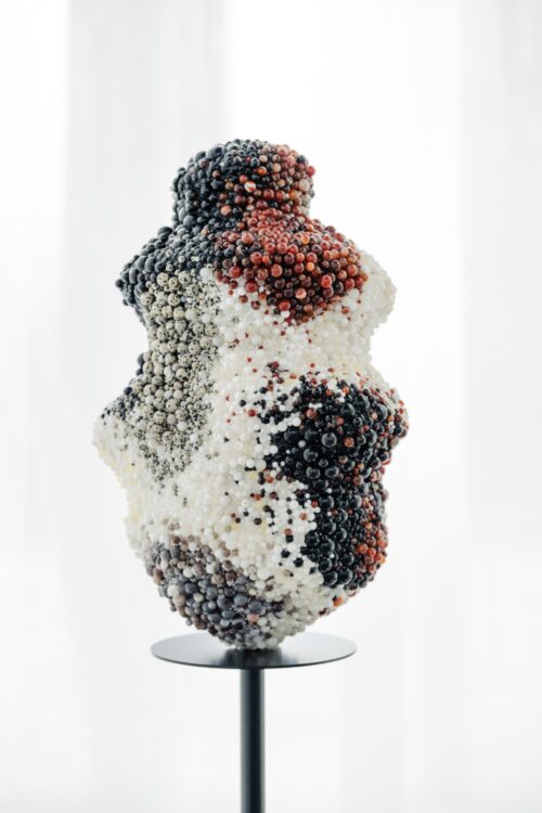 Dans le second espace d’exposition, trois sculptures habillées de perles trônent sur de hauts socles, comme en apesanteur. Il s’agit d’une collaboration entre l’artiste Pauline Guerrier et la maison Desrues, spécialiste du bouton et de la parure de luxe. Avec ce projet, la plasticienne illustre la cardiomyopathie de takotsubo, un terme médical qui désigne les conséquences physiques d’un chagrin d’amour sur la forme du cœur. Pauline Guerrier a ainsi collecté des radiographies de personnes atteintes de ce syndrome, dont les déformations confèrent aux œuvres un aspect très organique, semblable aux sillons qu’une main laisserait en serrant trop fort. Dans les interstices des plus grosses perles, de très petites viennent combler les fissures, dans un geste qui n’est pas sans évoquer le kintsugi. Une attention portée à la faille, à sa réparation et à ce qu’elle révèle, qui rapproche aussi ces pièces d’une sensibilité wabi-sabi, concept esthétique et spirituel qui célèbre l’imperfection.