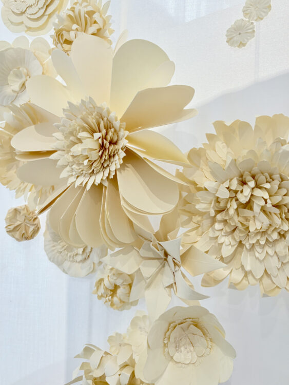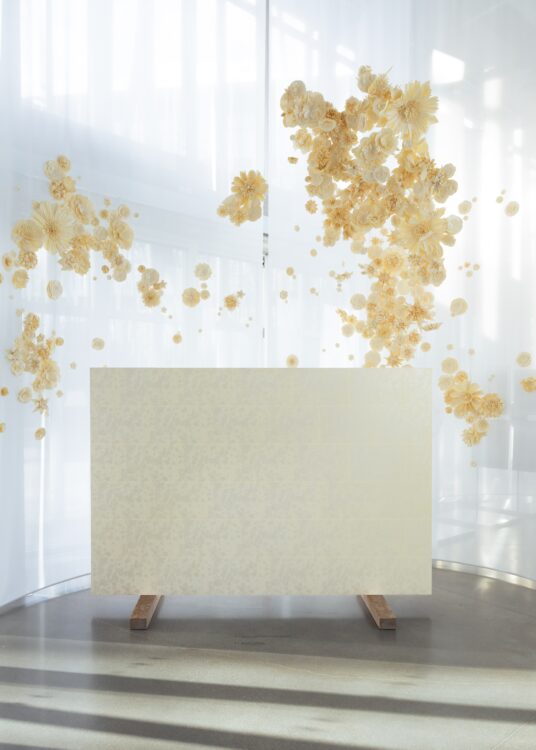 Dans la section « Vent (風, fu) », tout semble n’être que légèreté et transparence. Au-dessus d’un grand tsuitate — un paravent japonais à panneau unique — s’élève une nuée d’une centaine de fleurs en papier, comme suspendues par la force d’un souffle. Cette pièce délicate fait dialoguer plusieurs savoir-faire : celui de Koh Kado, du studio Kamisoe, à l’origine des fleurs en papier karakami, un papier décoratif japonais traditionnel imprimé à la main à l’aide de blocs de bois ; celui de Yasuyuki Kanazawa, de Kanazawa Moku Seisakusho, pour les deux pieds en bois sculpté ; et celui de Yukio Fujita, de Fujita Gasodo, pour la menuiserie et l’encadrement. De son côté, la maison Lemarié imagine un motif floral imprimé que l’on retrouve sur la toile, puis décliné en volume avec ces fleurs de papier suspendues, qui semblent peu à peu s’affranchir de la surface du paravent.