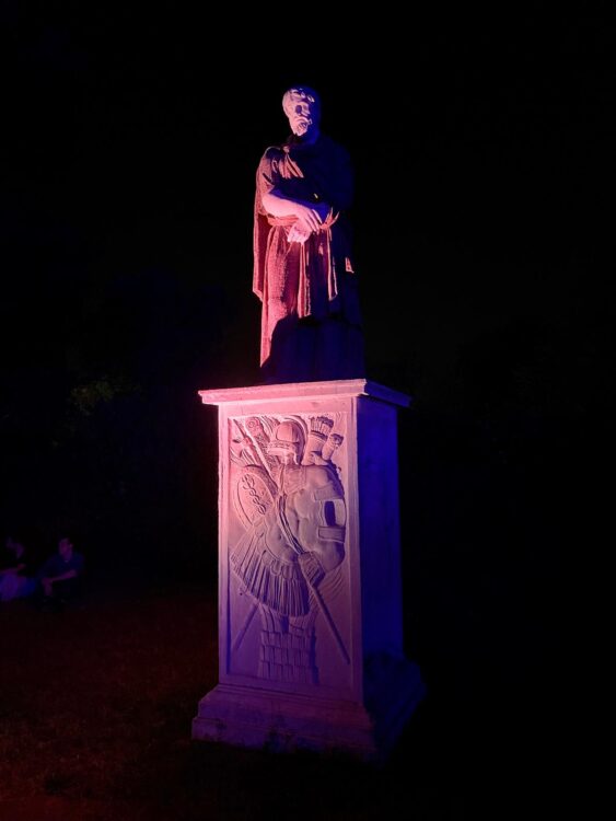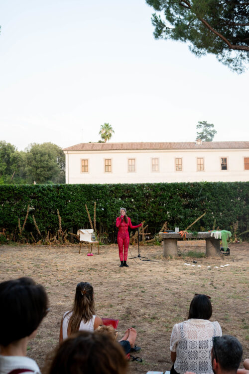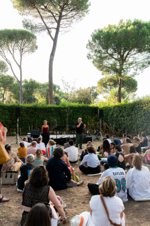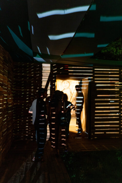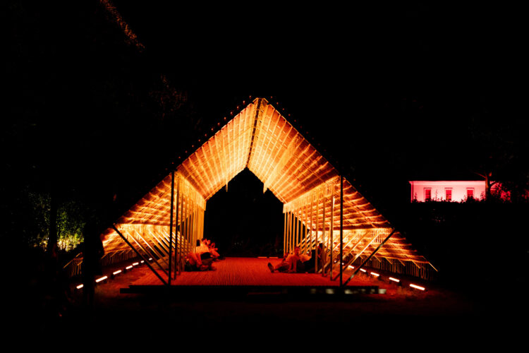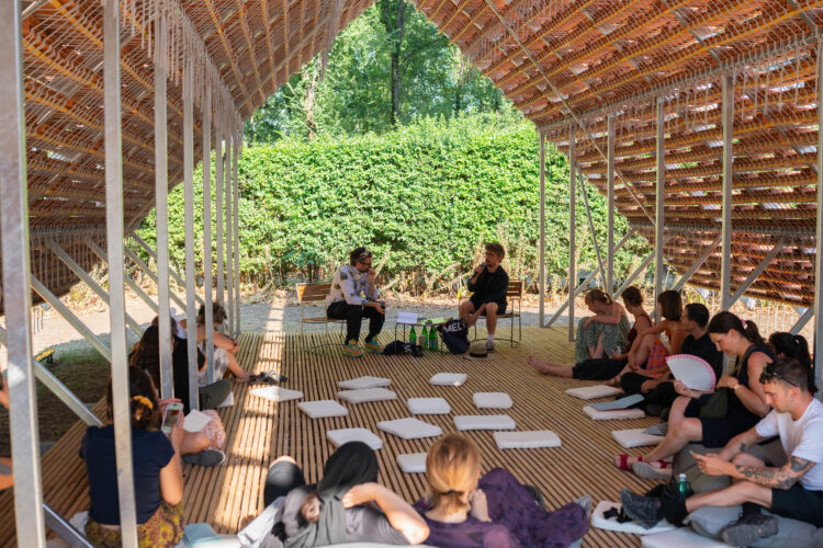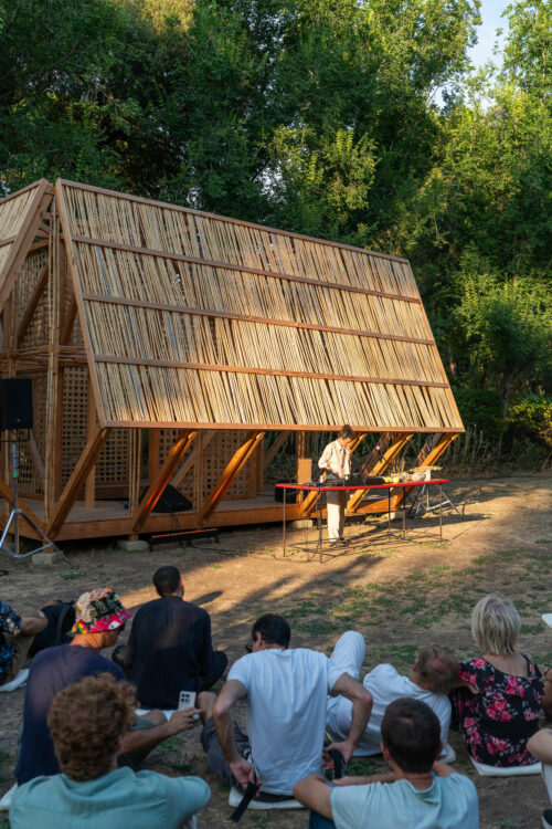 Le thermomètre affiche 36 dans les jardins de la Villa Medici. Quelques degrés de moins, heureusement, à l’ombre de la Cabane L7 signée MBL Architectes, l’une des cinq créations architecturales présentées cette année dans le cadre du Festival des Cabanes. Bien que son co-créateur, Sébastien Martinez-Barat, hésite encore à la nommer cabane. Pavillon, peut-être. Refuge ou temple sûrement. « On a commencé ce pavillon à la mort du Pape François et on l’a achevé le jour où le nouveau a été élu. Comme une boucle symbolique, presque sacrée. » La rencontre architecturale, qui prend la forme d’une conversation entre l’architecte et le philosophe Emanuele Coccia, est la première manifestation à laquelle nous assistons dans le cadre de la Nuit des Cabanes – Habiter Demain. Le programme dense du premier jour, marqué par les tables rondes hautement inspirantes de l’événement co-créé avec BNP Paribas (lire notre reportage sur Habiter Demain), déroule à toute vitesse et nous fait manquer, de peu, la performance théâtrale Planetaria. Hauts les cœurs, la manifestation ne fait que commencer et la nuit n’est pas encore tombée.