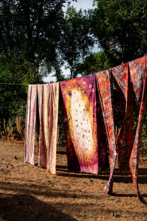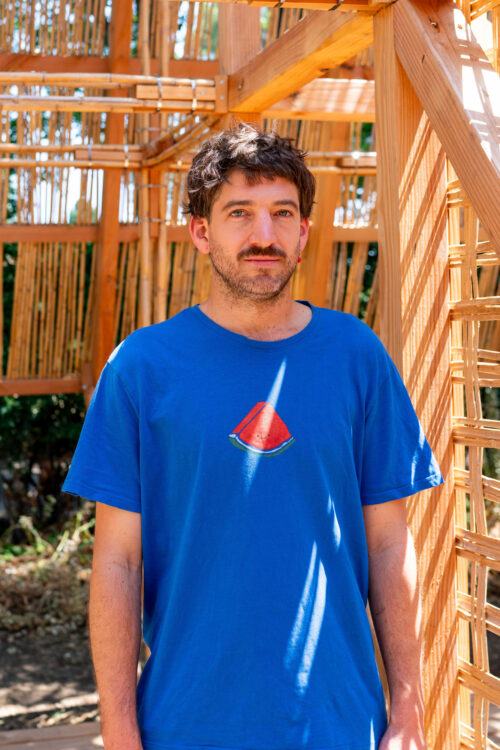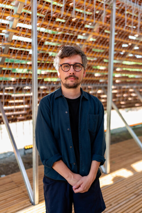 A l’abri de la Cabane L7 érigée à la façon d’une « toiture habitée » à la fois dépouillée et méditative, la conversation s’engage. Bercés par le chant continu des cigales, on écoute, activement, tant le dialogue nous pousse à la réflexion. Le festival invite les architectes à repenser leurs pratiques à l’heure de la crise climatique, en répondant à ces questions : comment proposer des formes architecturales non invasives ? Quelles solutions d’habitat durable pour demain ? Sébastien Martinez-Barat interroge les matériaux, leur impact, leur évolution et ce pavillon, qu’il imagine avant tout comme un espace de lecture, devient alors plus qu’un simple abri : un manifeste discret pour une architecture sensible et adaptable. « De notre point de vue le bois, dans l’architecture éphémère, n’avait pas vraiment sa place. Ce qui nous intéressait, c’était justement cette idée de réversibilité et de fragilité assumée. La brique romaine, à l’origine, a été pensée pour être montée, démontée et remontée sans fin. » poursuit le jeune l’architecte. Et d’ajouter : « Il y a quelque chose de magnifique dans la brique. Mais aujourd’hui, on l’a figée, on a oublié qu’elle pouvait être réversible. » Devant nous, les briques du pavillon ne sont pas scellées, elles sont attachées avec soin et précision, « comme on nouerait un paquet cadeau », glisse t-il. Ce geste de nouage devient ici une manière d’honorer le matériau, de le sécuriser sans l’enfermer. Alors, en levant les yeux, les 4600 briques suspendues par 1200 nœuds prennent soudain une autre dimension. Plus qu’un assemblage, une pensée : celle que rien, ici, ne doit être perdu.